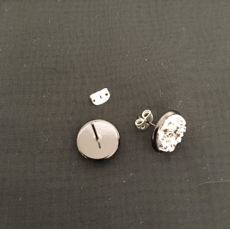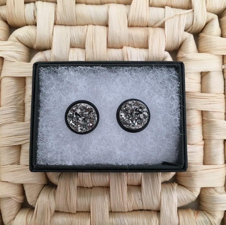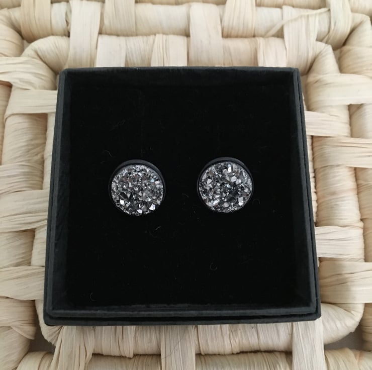Pretty and glittering studs made from resin, the angles of the particles reflect the light bringing the colours to life. The resin cabochons are set in black ear fittings to produce a different and unusual finish. Because the surface of the druzy stone is created using tiny pieces of resin it does not have a smooth surface.