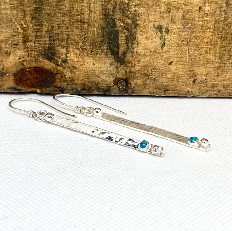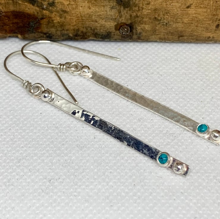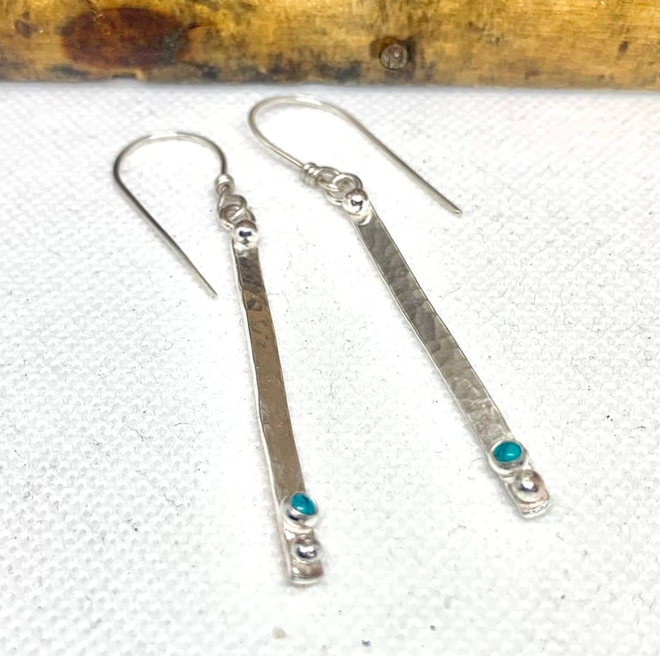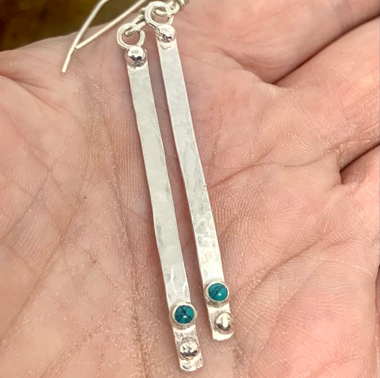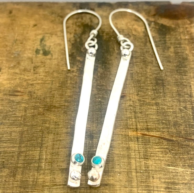 pretty earrings that have been made with recycled Sterling Silver. The Silver has been slightly textured which catches the light when worn. A Turquoise stone has been set on the earring along with a granulated ball of Silver,