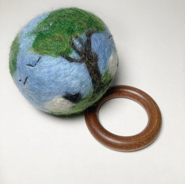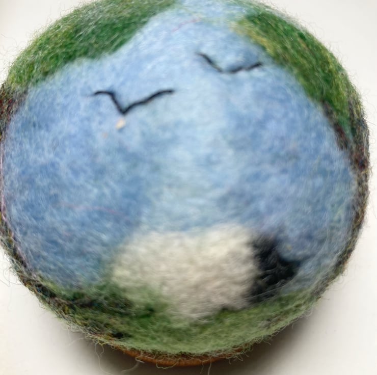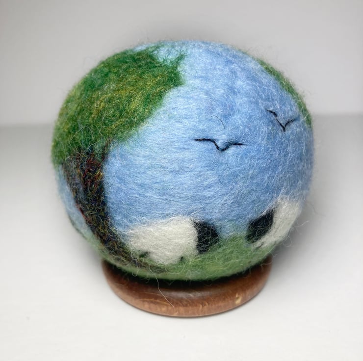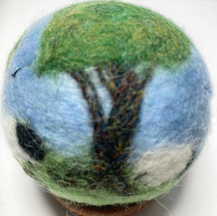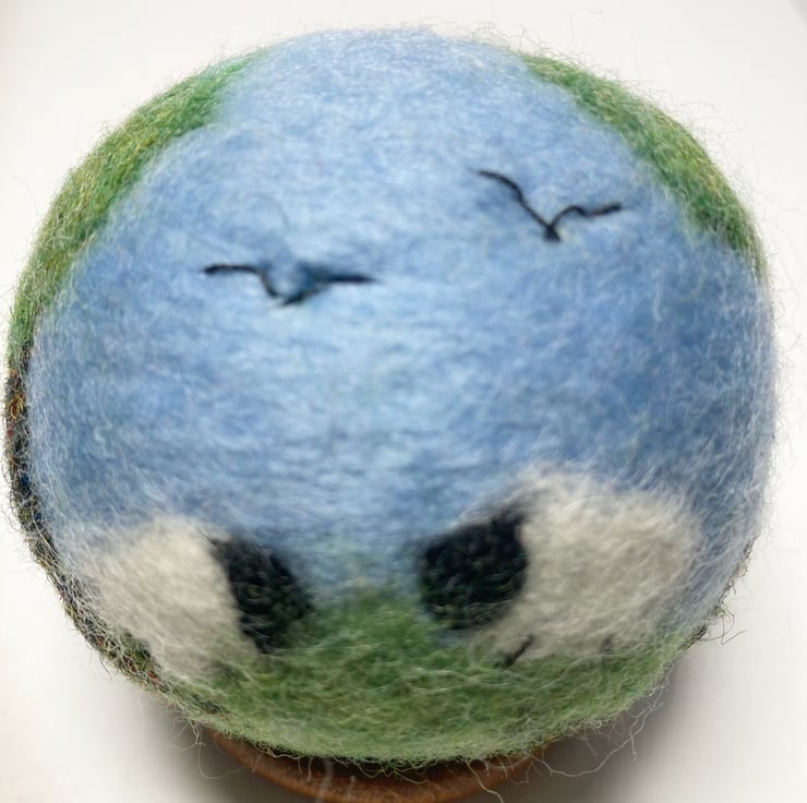 A decorative orb featuring sheep in the fields and trees, made from woollen fibres. The sphere has been felted using woollen fibres and then a layer of merino wool fibres in blue and green has been added to create the background colour. Trees and sheep have then been added. The sheep and trees have been added all around the sphere to provide decoration in all orientations. The sphere has then been felted for a second time to ensure all the woollen fibres adhere and are well felted. Finally a few birds have been added using black thread.