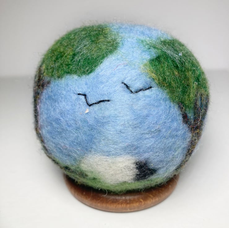 The orb measures approximately 8cm in diameter and a repurposed wooden curtain ring used as a base to enable it to maintain stability when on display. Should you wish to use the orb as a hanging decoration a hanging loop can easily be stitched to the top.