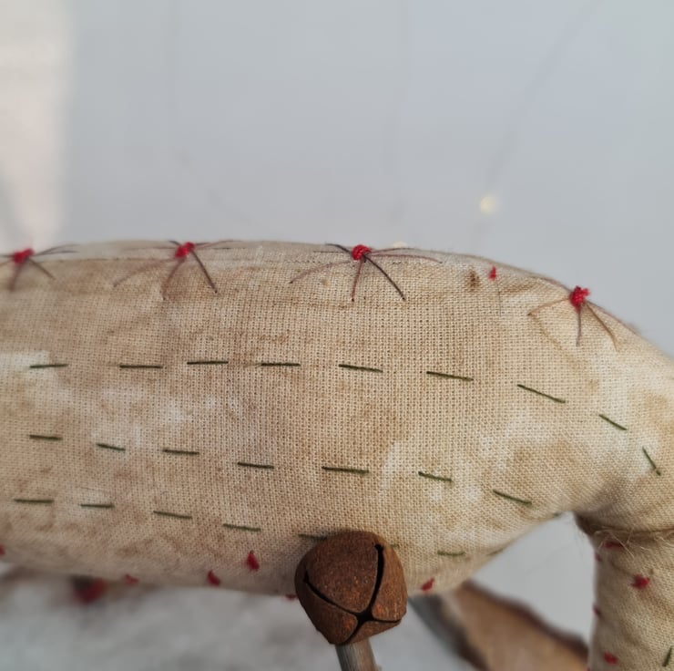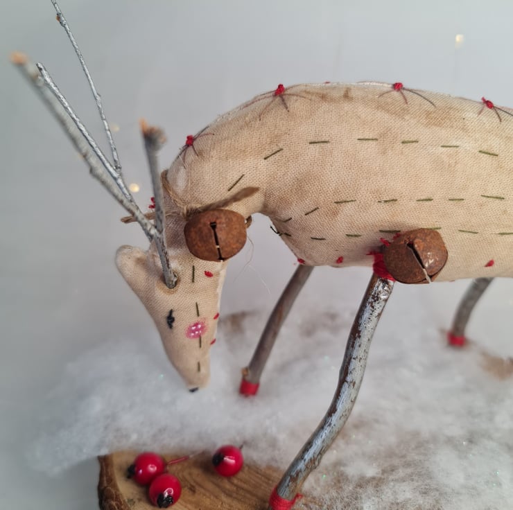 His limbs and antlers are made from wooden sticks. Rusty tin bells embellish each leg and around his neck. His back end is a wee tail made from wool roving.
