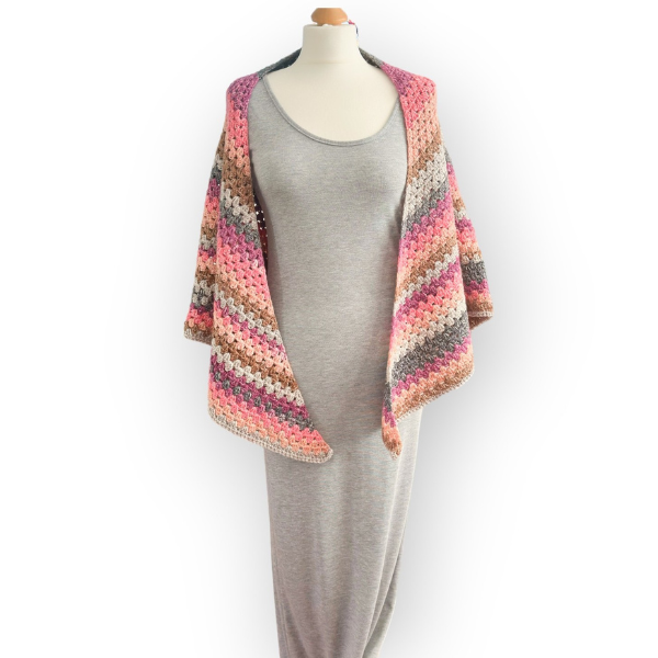 Wrap yourself in soft, cosy style with this beautiful triangle-shaped shawl, crocheted in a classic granny stitch using variegated yarn.