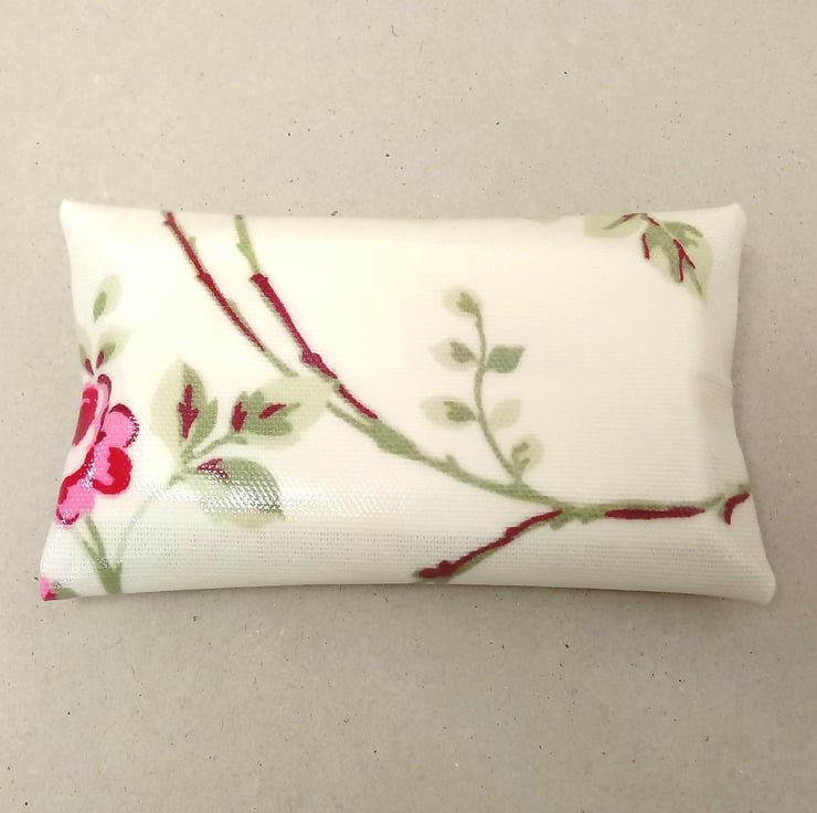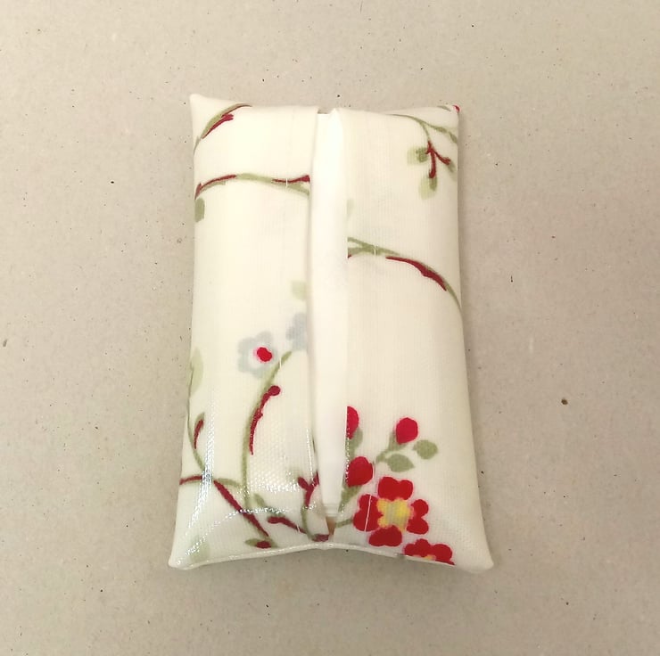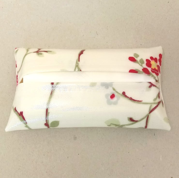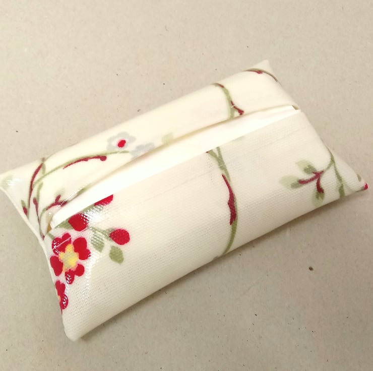 This is a lovely tissue holder, handmade in a cream oilcloth with red and pink flowers.