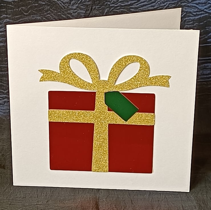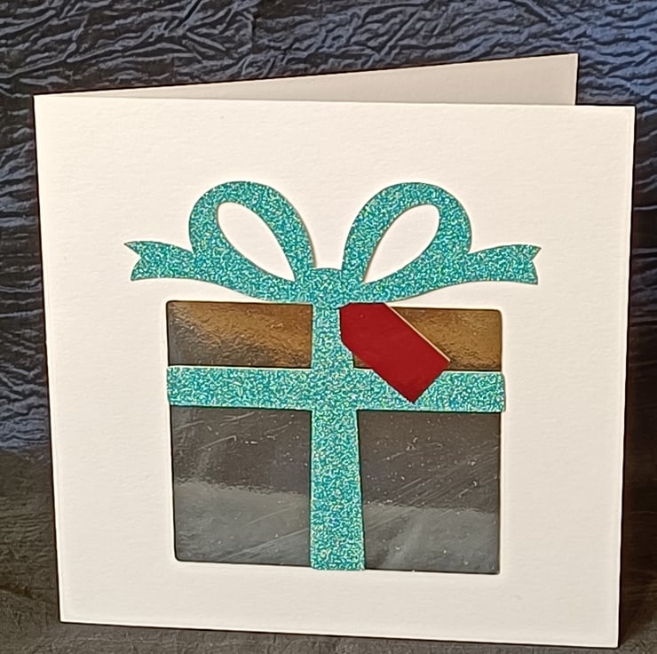 White card base with a silver and blue die cut present and bow with a pink gift tag on the front, stamped with 'wishing you a merry Christmas' inside.