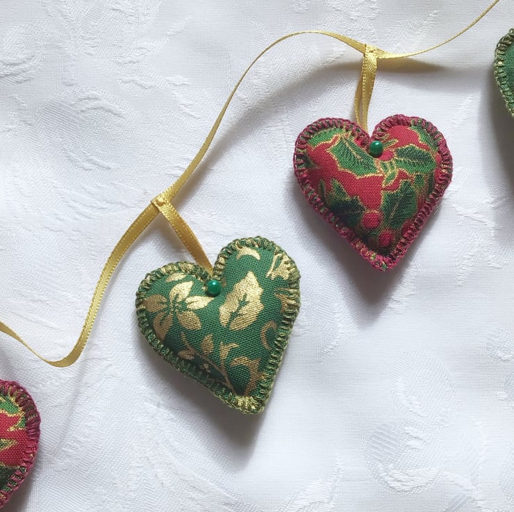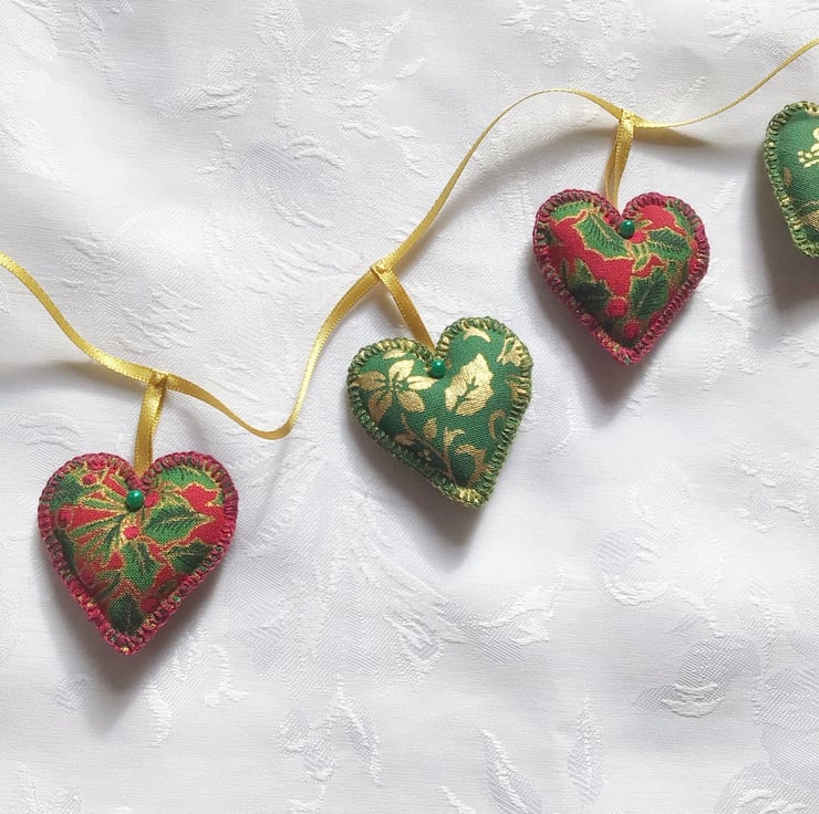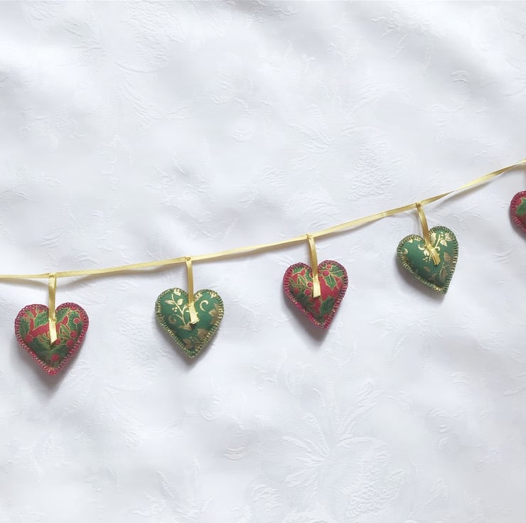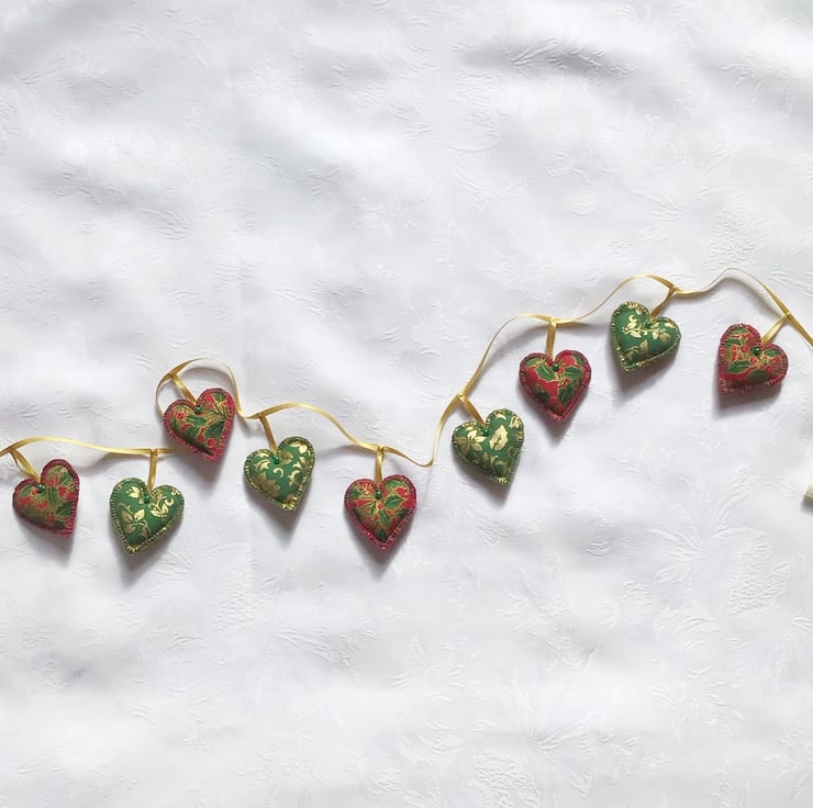 There are 9 hearts 1.5” x1.5” (5 red and gold and 4 green and gold). The garland measures 49” (125cm)