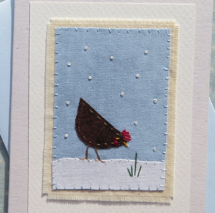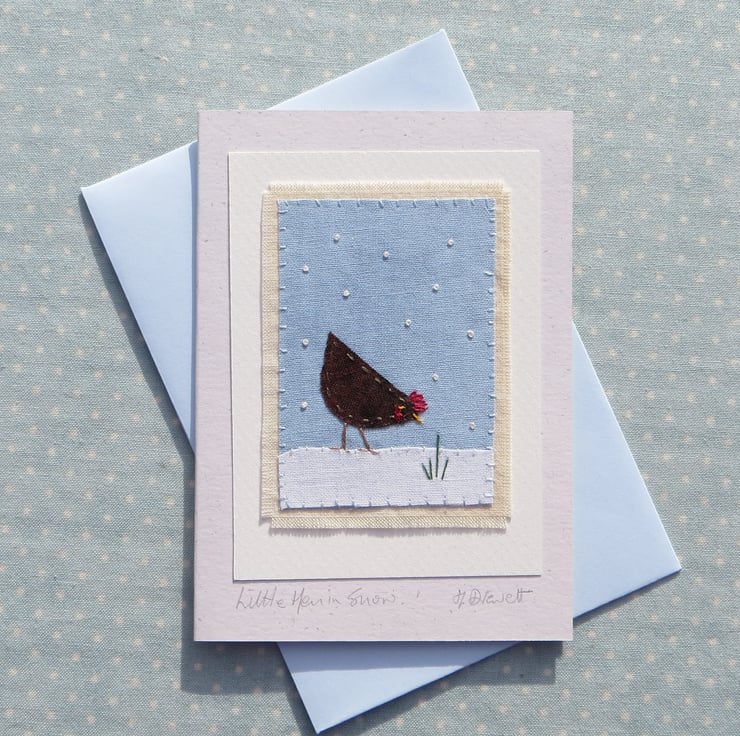 All my cards measure 12 x 9 cm and come with toning recycled paper envelopes in clear protective compostable cornstarch sleeves, no plastic! Each card is signed on the front and my studio stamp is on the back. Cards are made from stout 100% recycled card - blank inside. The title is written below the textile: 'Little Hen in Snow'.