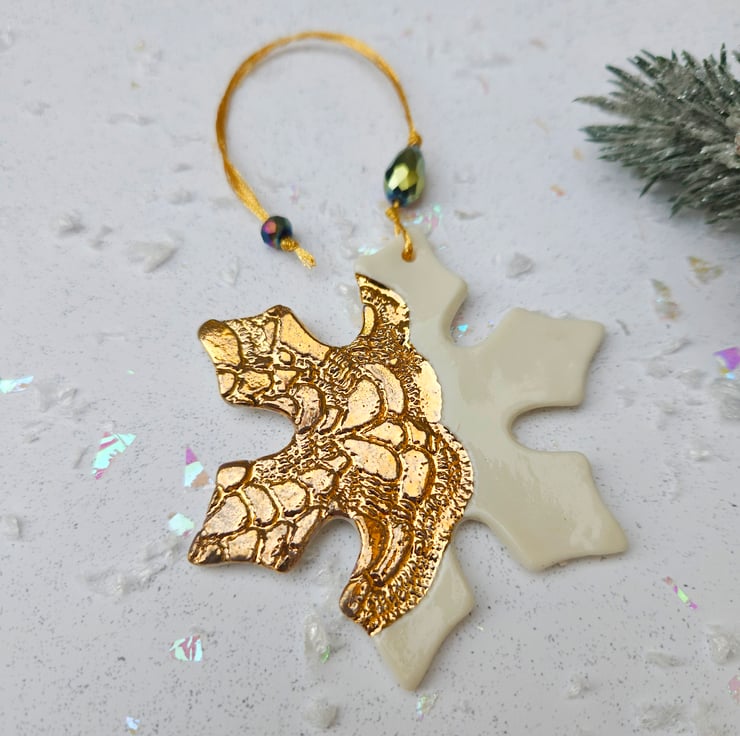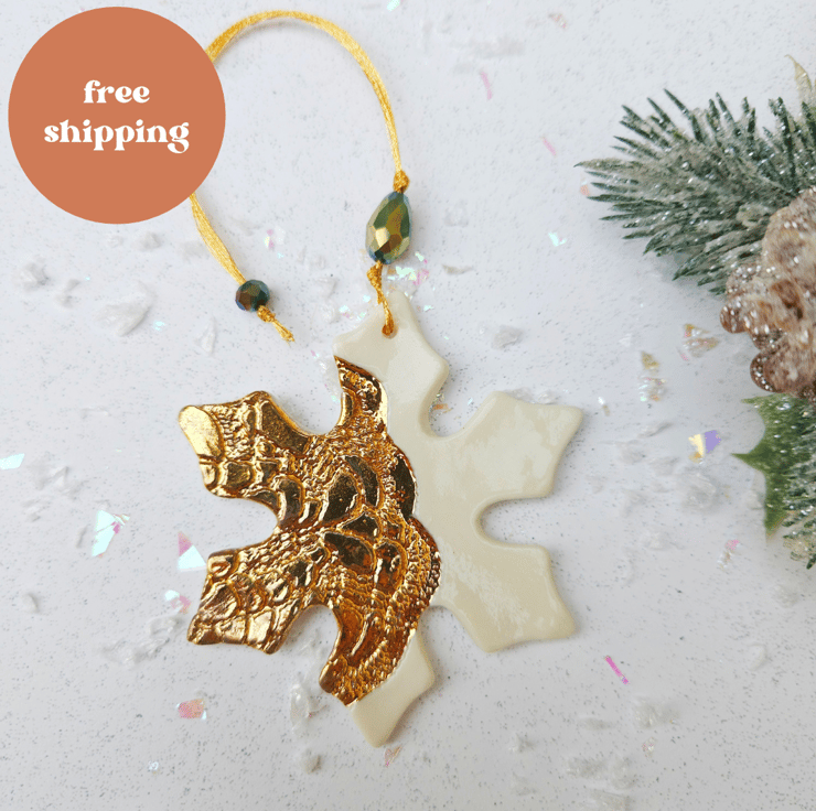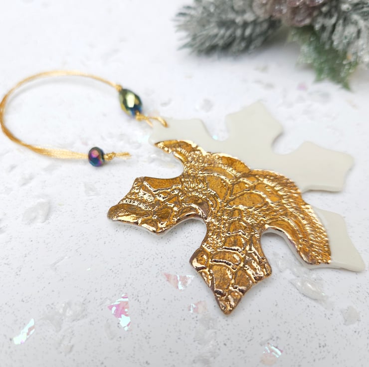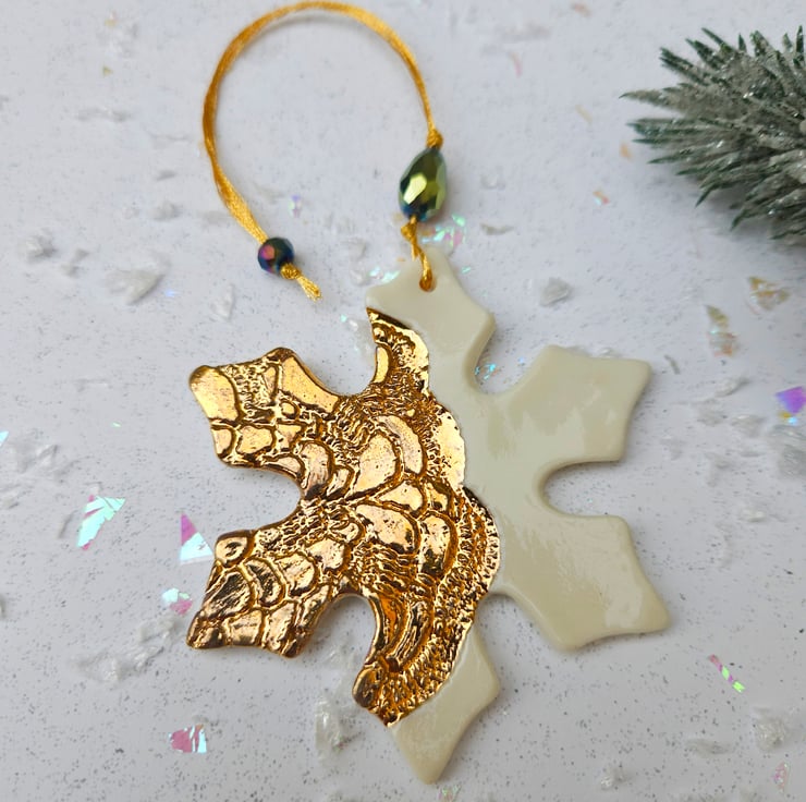 This is a fine porcelain snowflake that has been imprinted on both sides with lace, before going through its first firing. It is then glazed, and has its second firing. Finally, each decoration is hand painted with 22ct gold lustre to give a high shine finish and goes through a third and final firing.