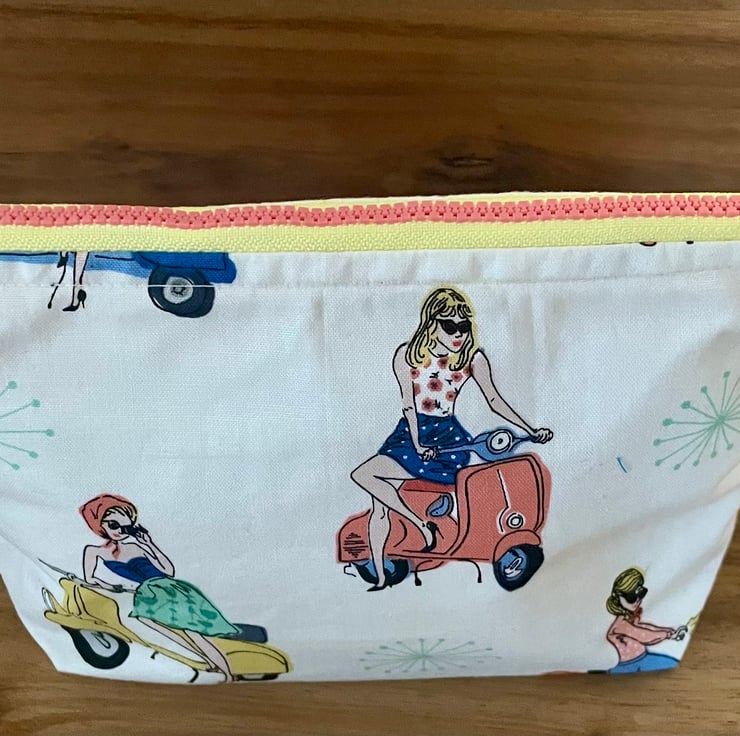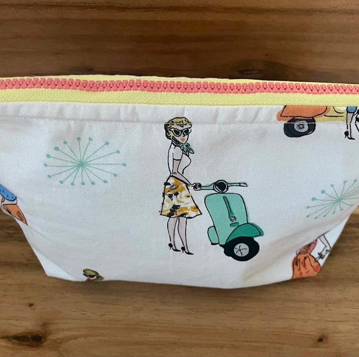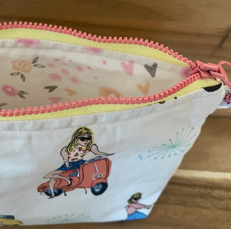 The small makeup bag, with a cute multi-coloured YKK zipper, is 22cm wide and 16cm including the base including the small base.
