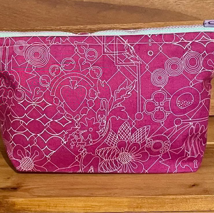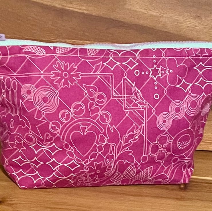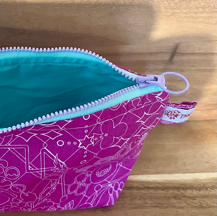 The small makeup bag, with a cute multi-coloured YKK zipper, is 22cm wide and 16cm including.