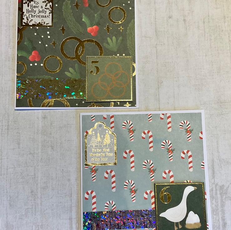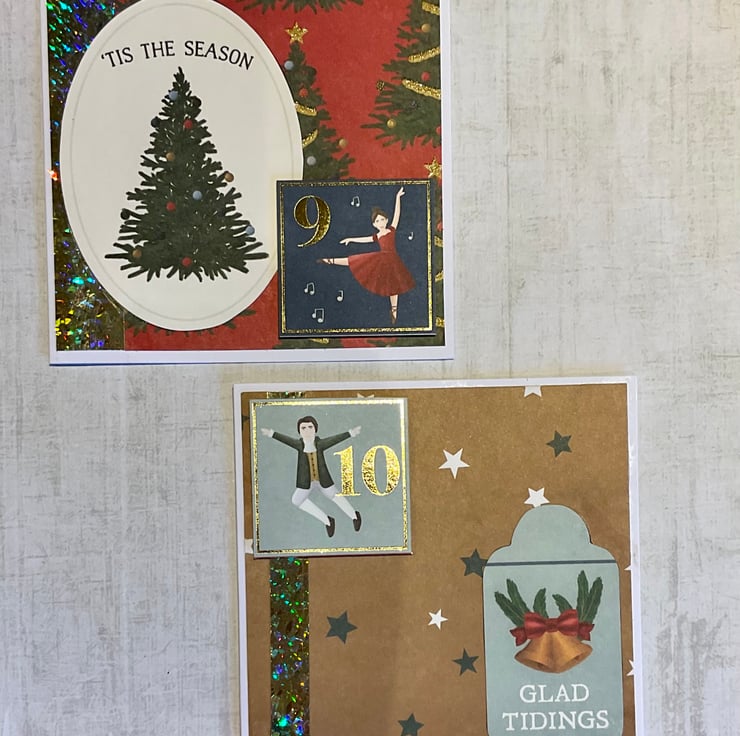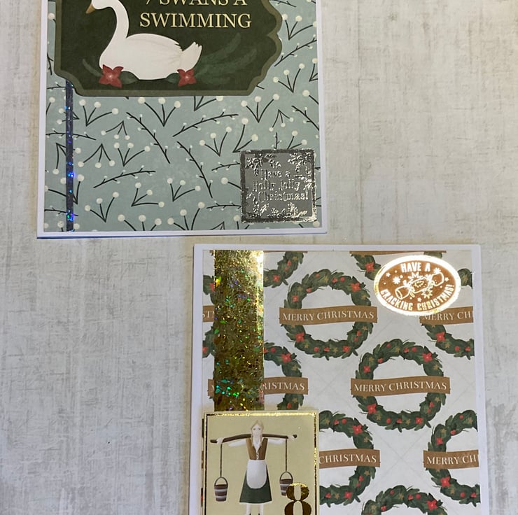 Each of the twelve cards has a topper featuring one of the gifts from the song and is set on a Christmas themed background on a white card base. Each card includes a seasonal greeting.