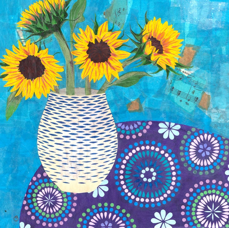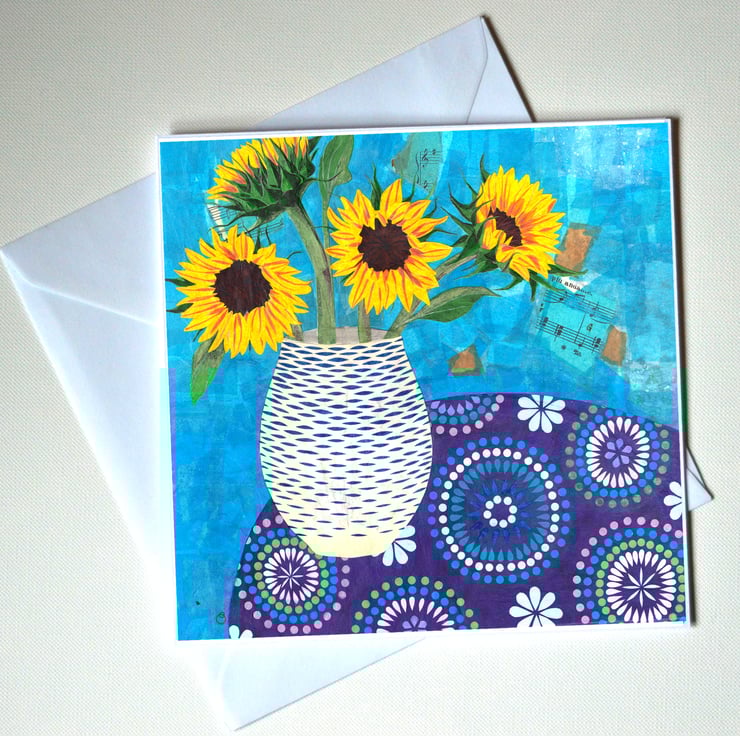 This is a handmade card featuring a digital print of one of my collages featuring a blue and white vase of sunflowers, on a decorative table cloth. The design was created entirely from cut out paper to create the collage. I have then digitised the image to create these cards.
