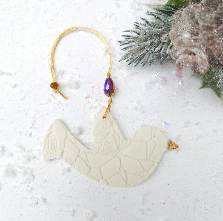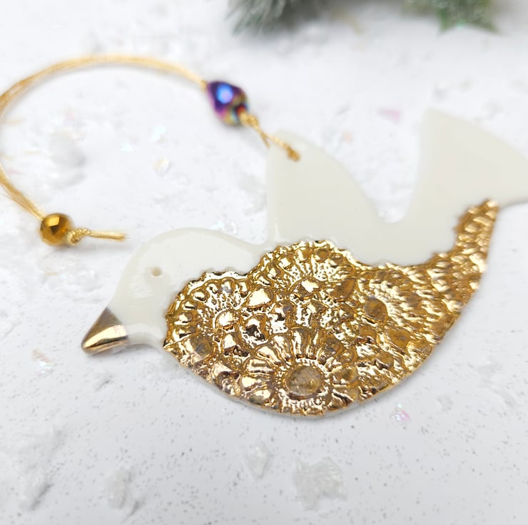 This is a fine porcelain bird that has been imprinted on both sides with lace, before going through its first firing. It is then glazed, and has its second firing. Finally, each bird is hand painted with 22ct gold lustre on its tummy to give a high shine finish and goes through a third and final firing.