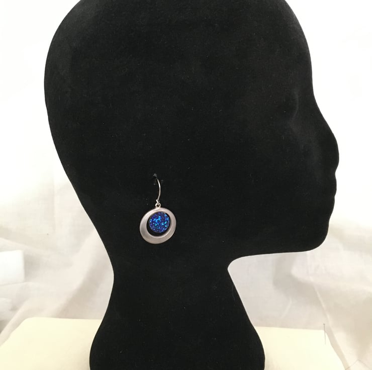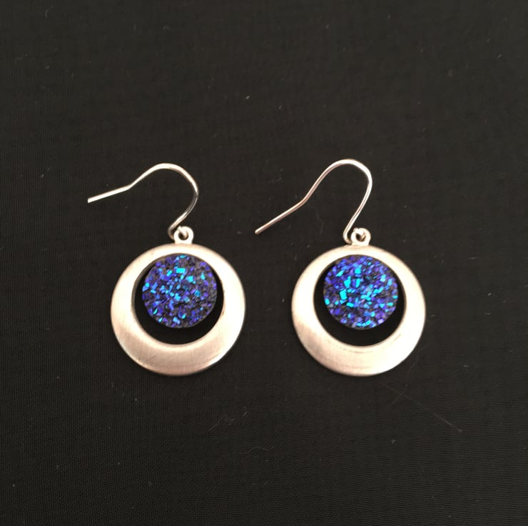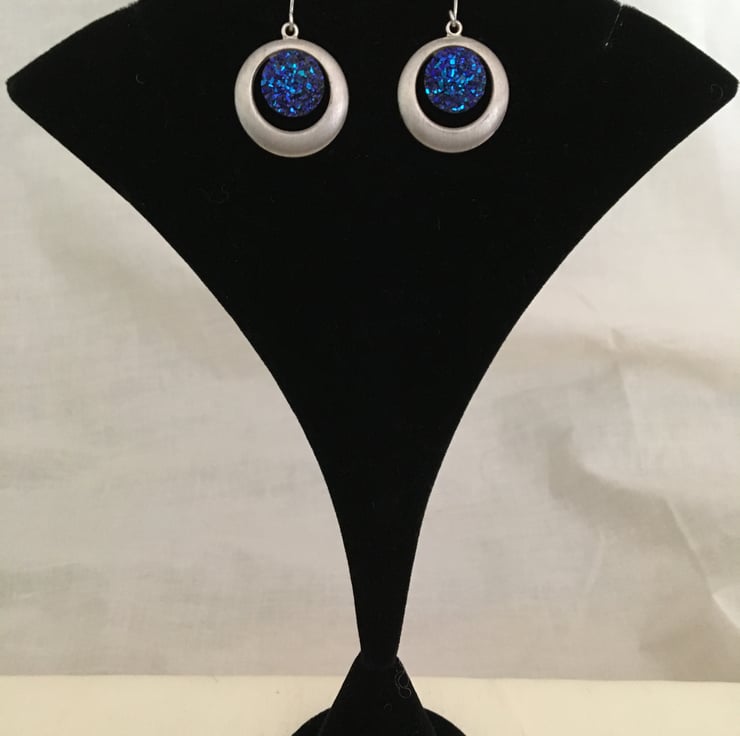 Round silver matt earrings with royal blue resin druzy cabochon centres. The particles mixed in the resin reflect the light bringing the sparkling colours to life. Because the surface of the druzy stone is created using tiny pieces of resin it does not have a smooth surface.
