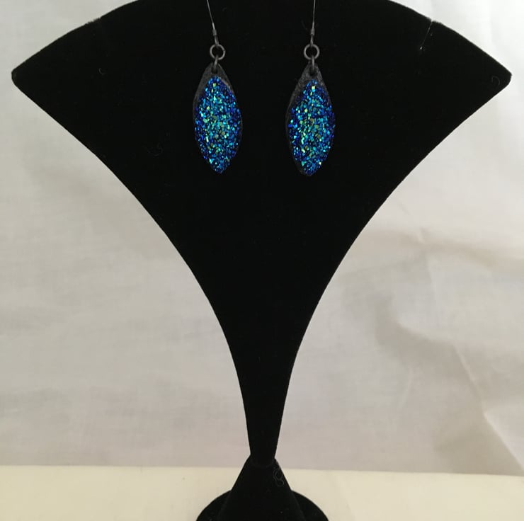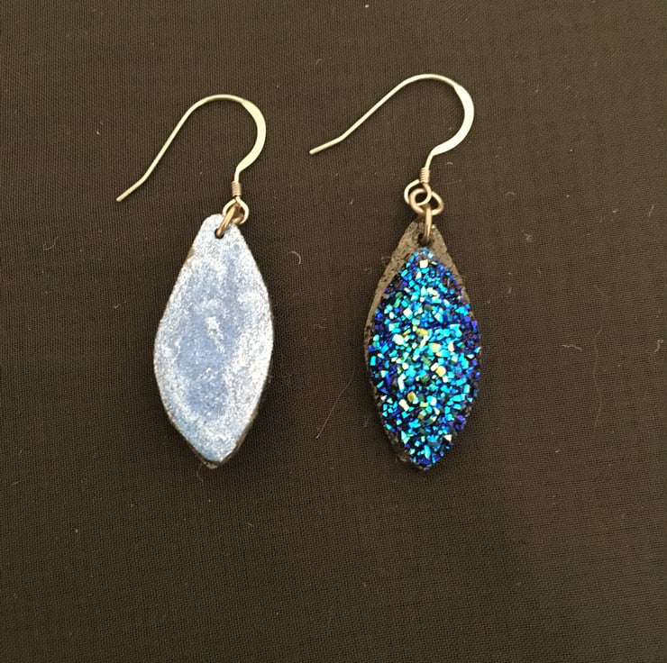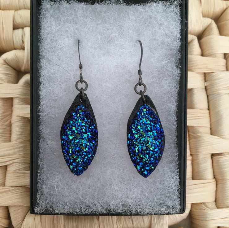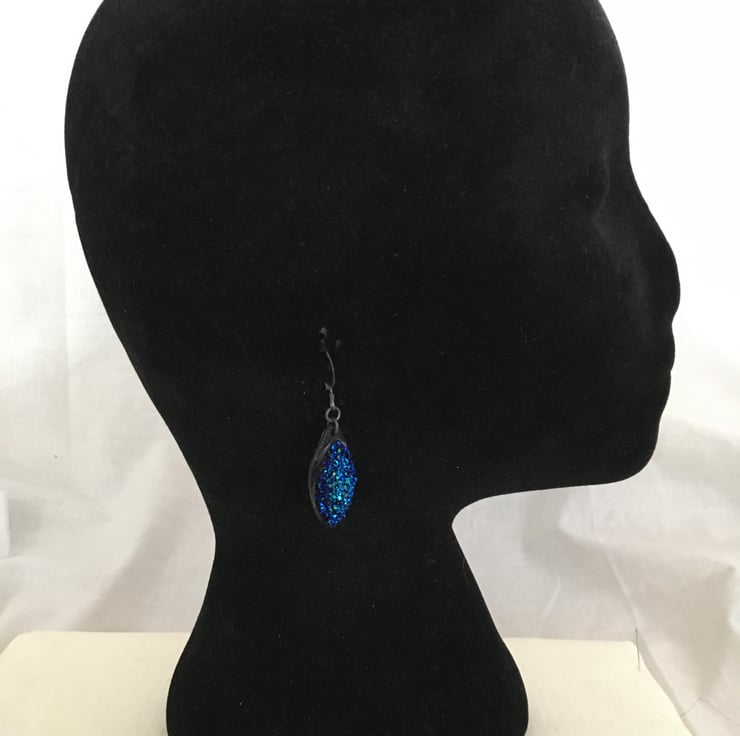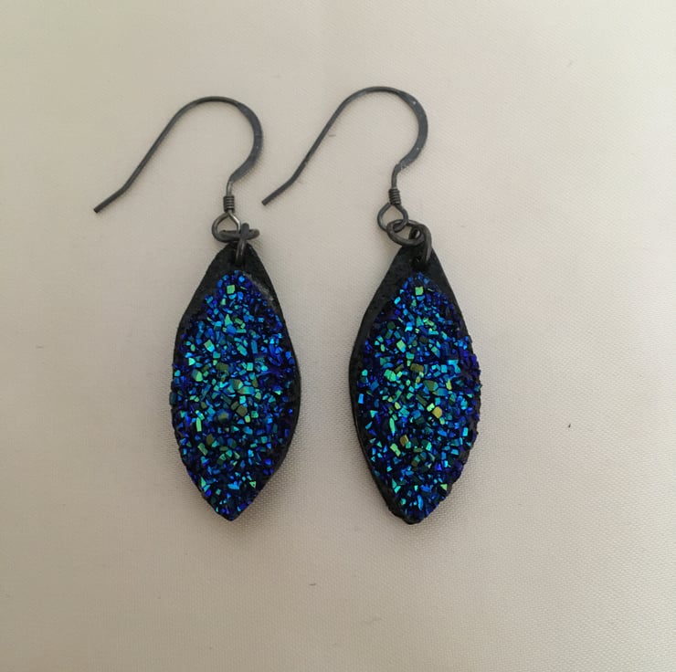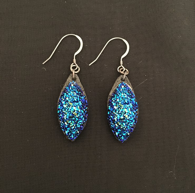 Sparkling royal blue earrings. The resin druzy cabochons are set in a polymer clay background, The particles mixed in the resin to form the druzy effect and reflect the light bringing the sparkling colours to life. Because the surface of the druzy stone is created using tiny pieces of resin it does not have a smooth surface.