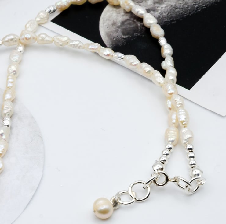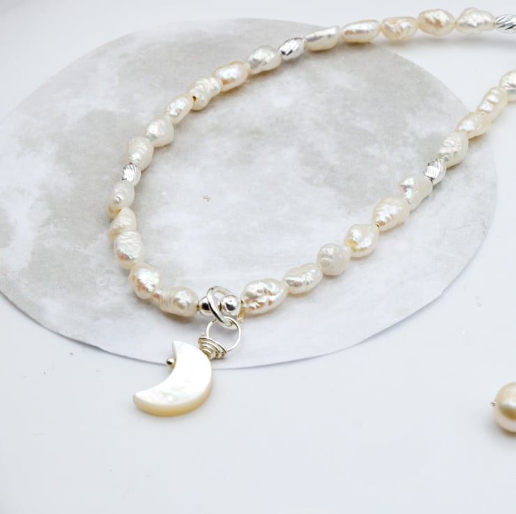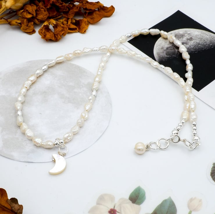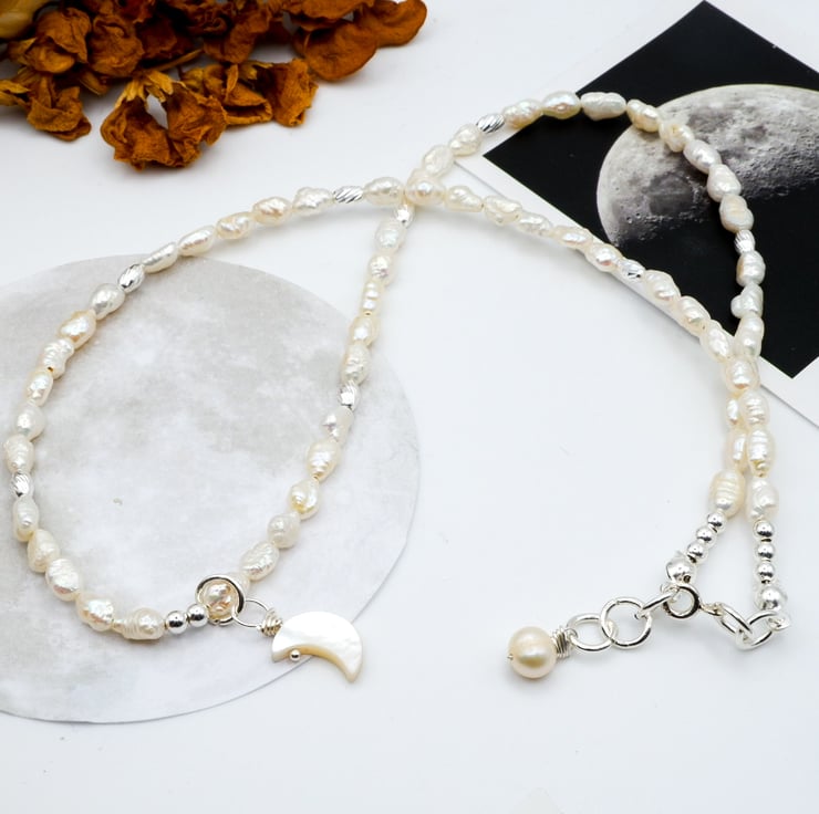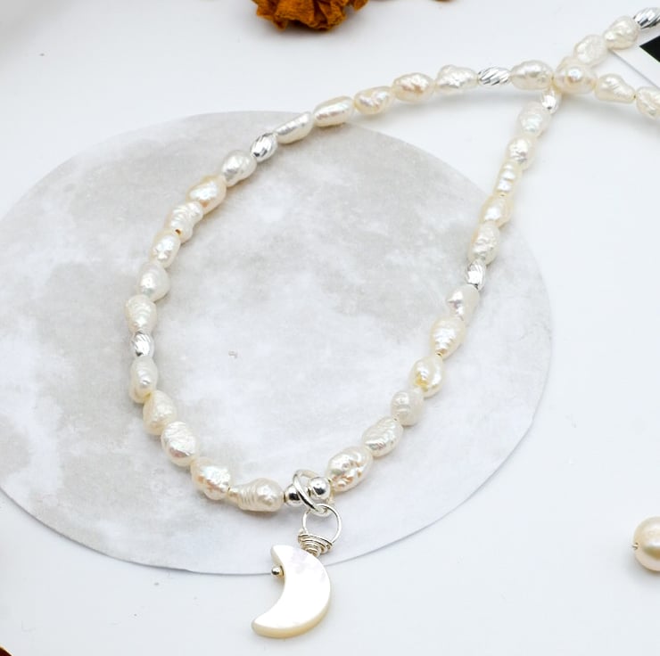 Handmade with lots of love in the East Midlands using sterling silver components, freshwater iridescent 'rice crispy' style pearls, sterling silver corrugated barrel beads, and a dainty, hand-carved mother of pearl crescent moon charm pendant.
