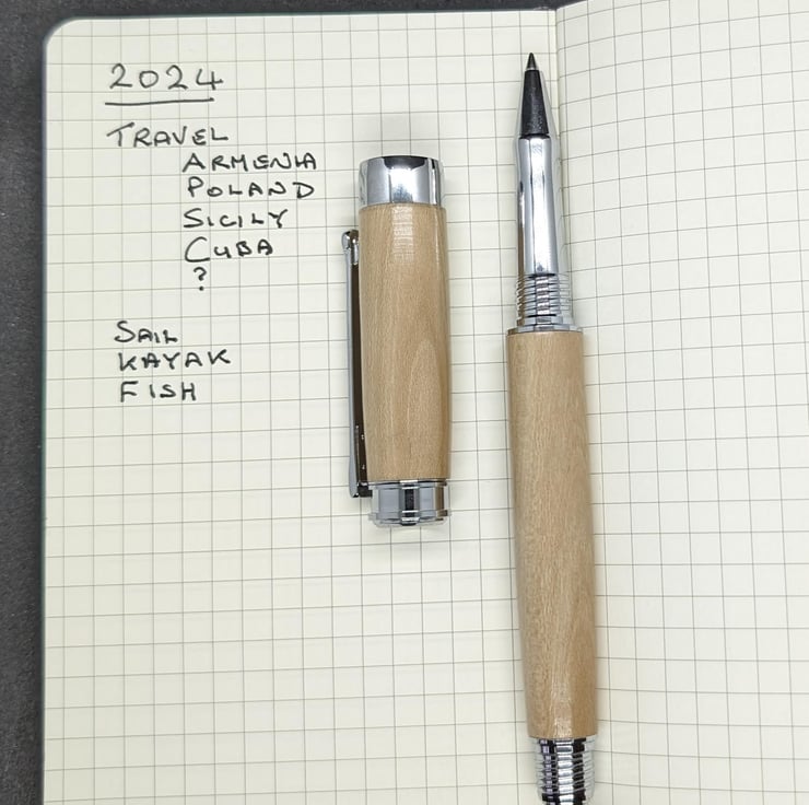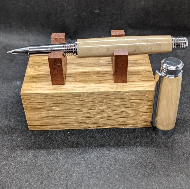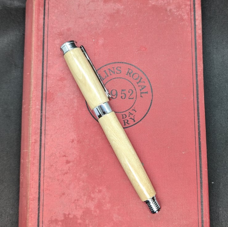 A hand turned capped rollerball pen in holly with chrome metal parts. It has a uniform, pale white colour with subtle grain pattern. The tree was seen as a fertility symbol and a charm against witches, goblins and the devil. The tip unscrews and it then takes Schmidt 888 style refills. It will be packaged in a material lined card box. Find links to ink at characterpens.co.uk/refill.html F316