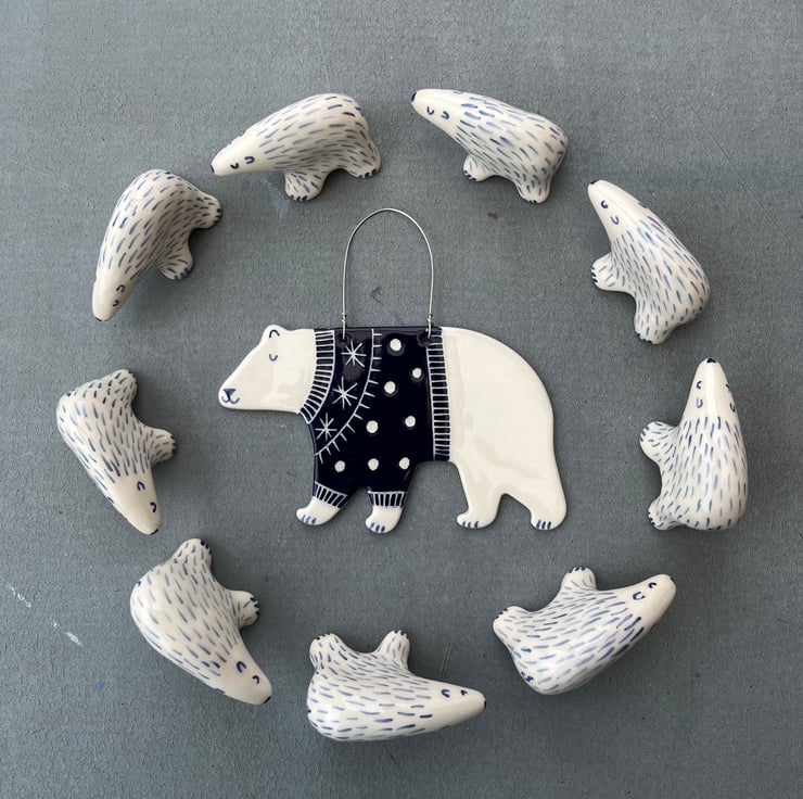Each decoration is hand made from white earthenware clay. It is then decorated with a dark blue slip and a hand drawn jumper design. A wire loop is fitted to allow the decoration to be hung.