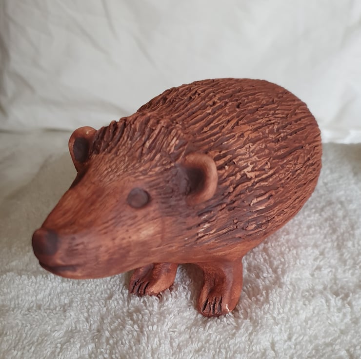 Handmade with earthenware clay using the pinch-pot and coiling methods. Its features have been attached with slip and the quills have been defined with a sculpting tool. It has been bisque fired and then gently sanded before applying a red iron-oxide wash. The iron-oxide has been applied with a brushed and then sponged off to give definition to its quills. A darker shade of iron-oxide has been applied to enhance its eyes and nose, after which it has had a second kiln firing to 1080C.