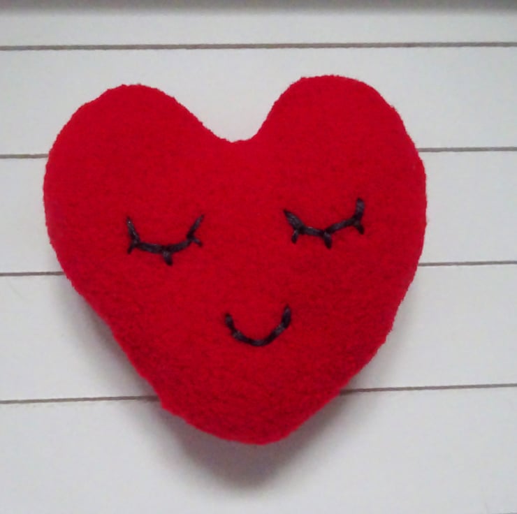 A hand sewn heart made with red fleece fabric and featuring a hand embroidery happy face.