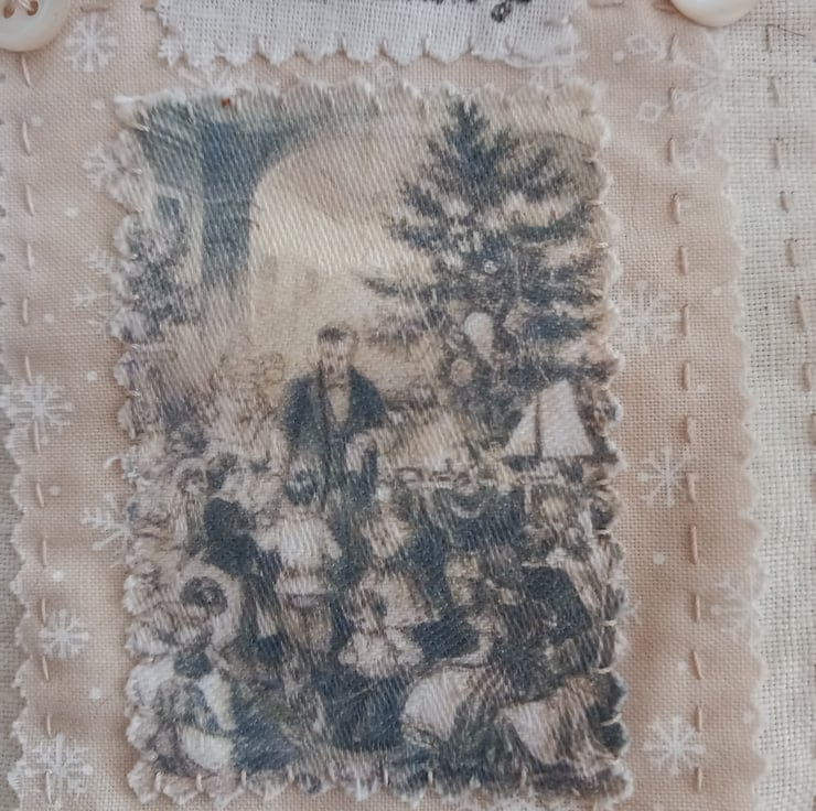 This decoration features a black and white image of a Victorian Christmas that has been stitched onto a snowflake fabric that is attached to a piece of vintage linen. Lace and vintage mother of pearl were used for decoration. Felt has been used for the backing and there's a hanger made from ric rac.