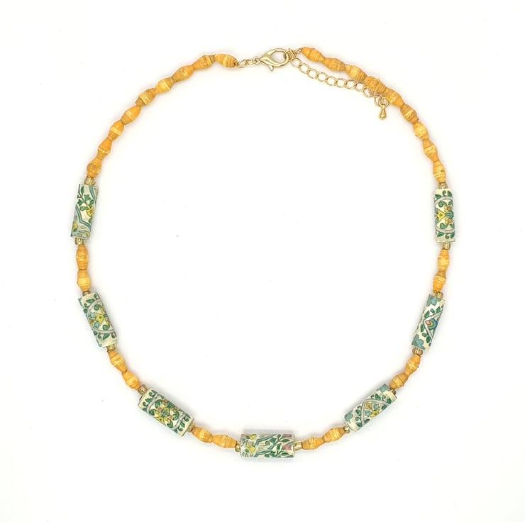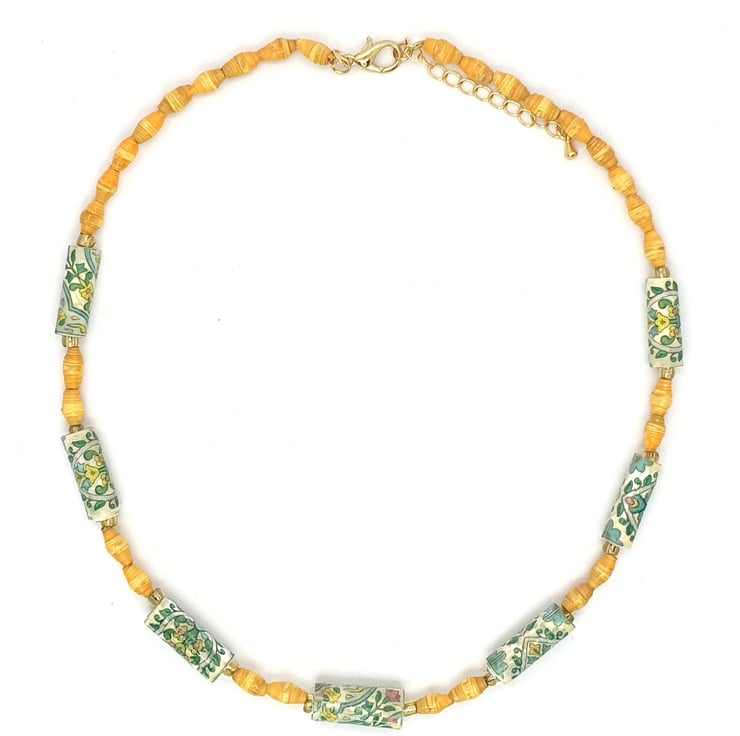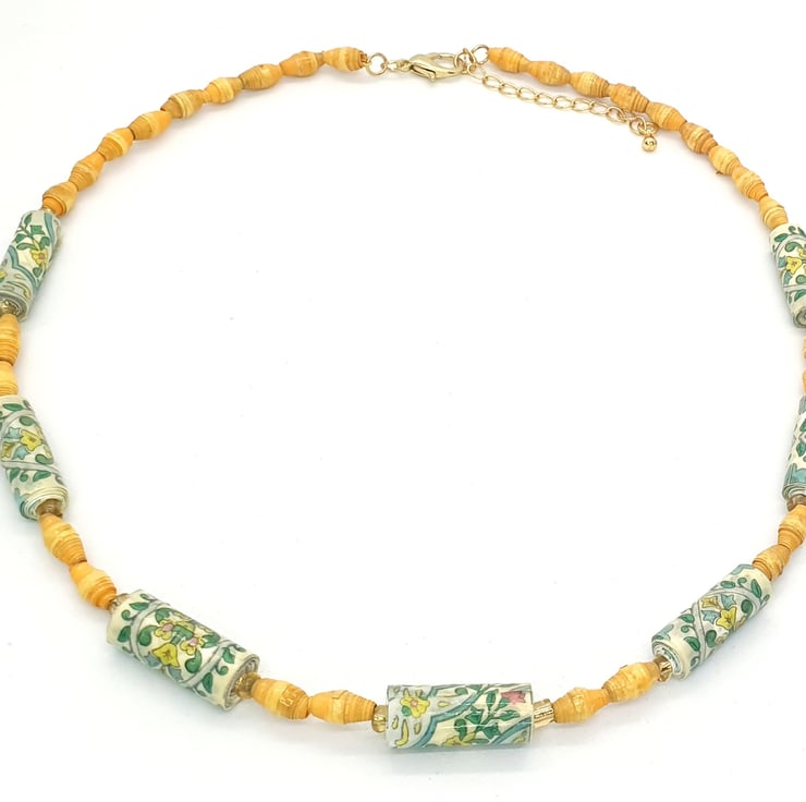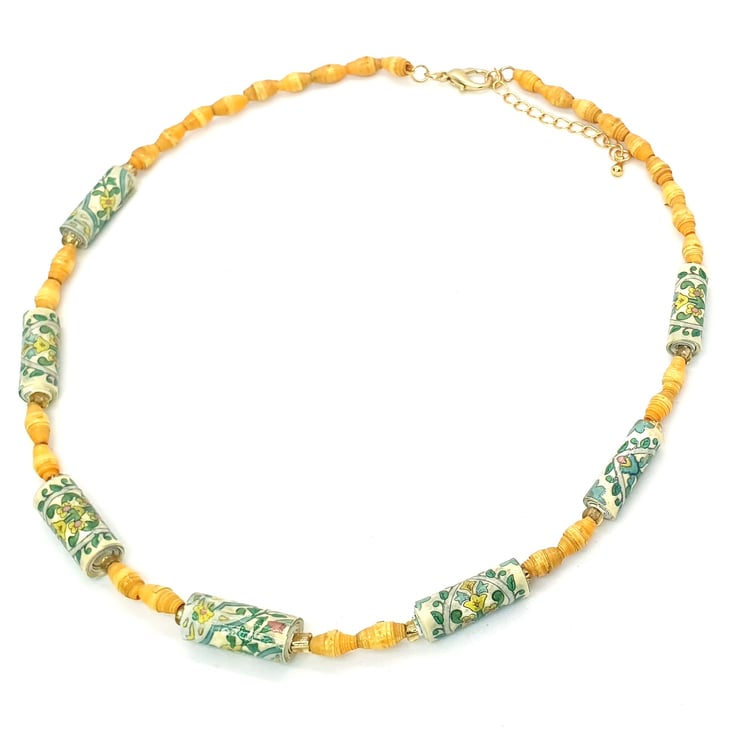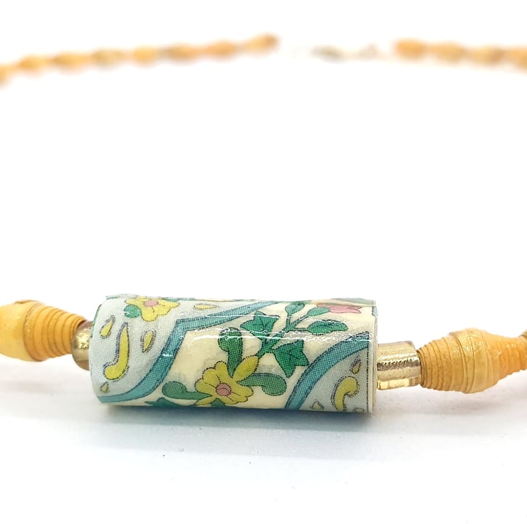This necklace speaks of the joys of spring; of foliage and bright yellow flowers. Made of unwanted soap wrappers. The soaps came in a set: the ones with foliage patterns were turned into small tubular beads and the bright yellow was transformed into tiny beads.