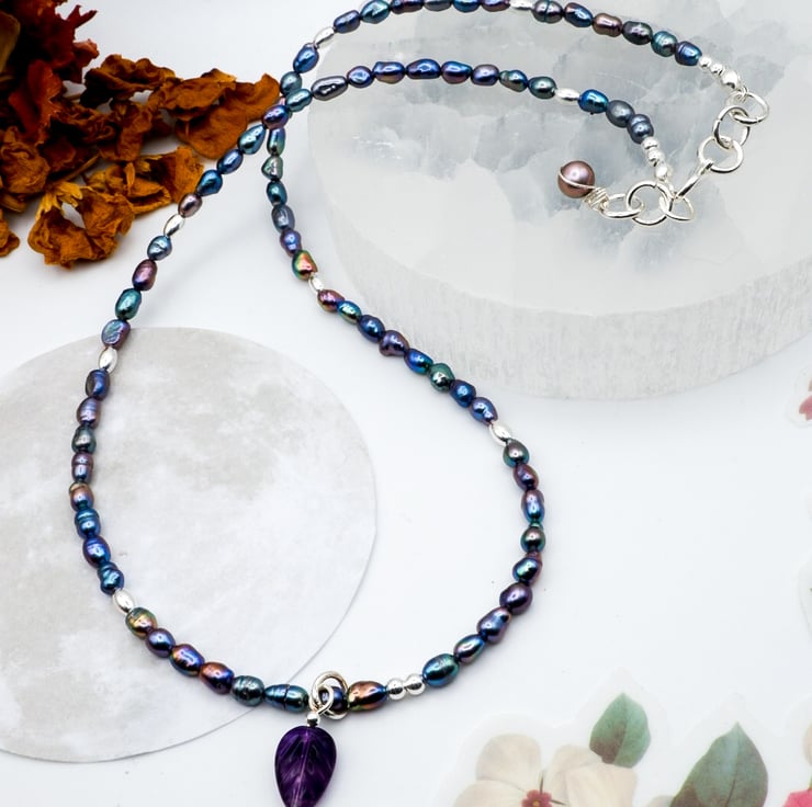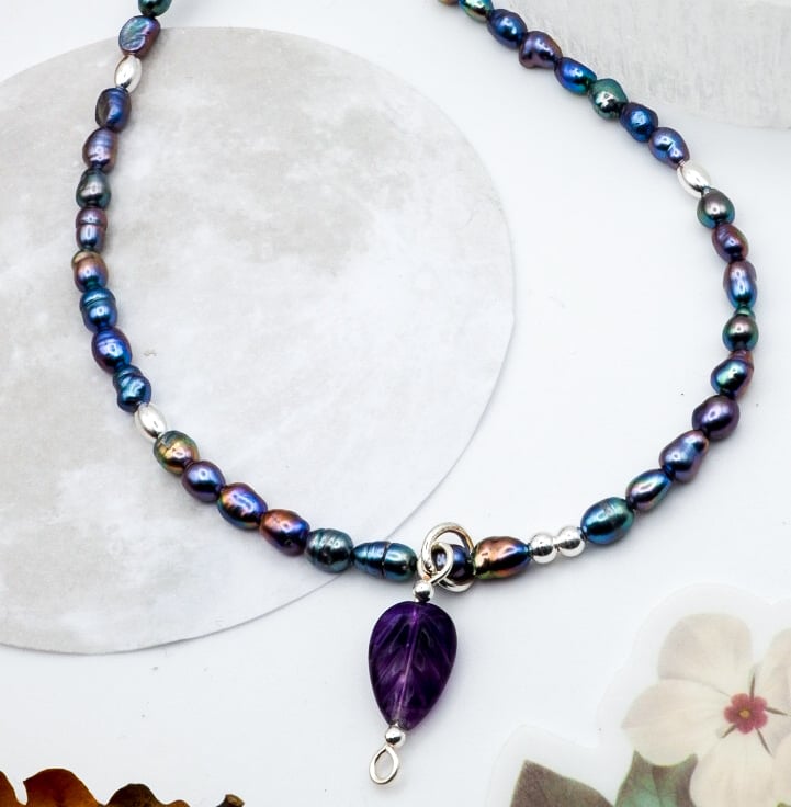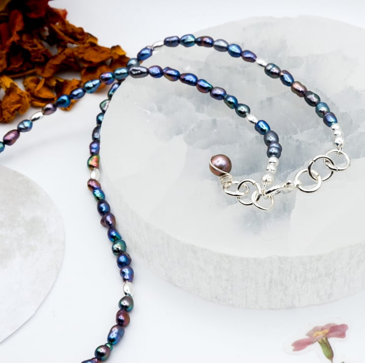 This necklace is made with beautiful, peacock-blue freshwater baroque 3mm rice pearl beads. Sterling silver components including clasp and corrugated barrel beads finish the piece.