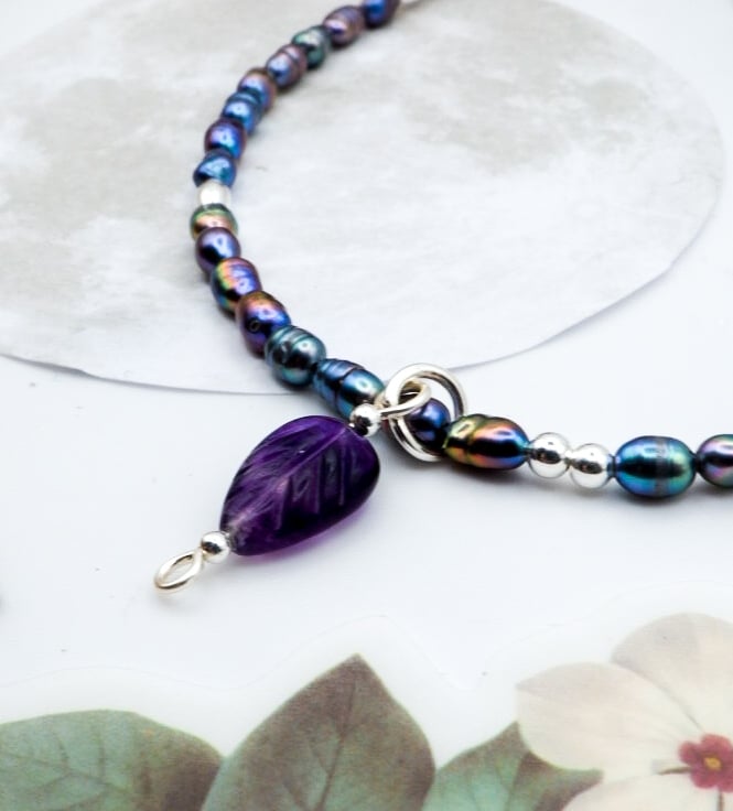 A pretty, hand-carved dark purple fluorite leaf gemstone charm pendant adds a touch of woodland whimsy!
