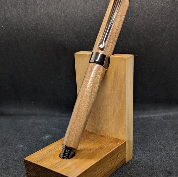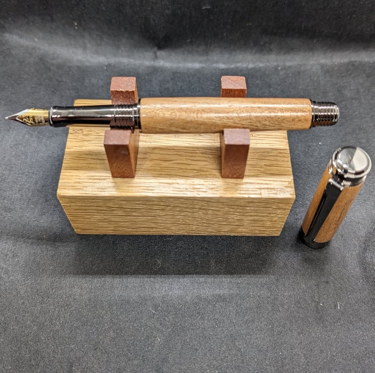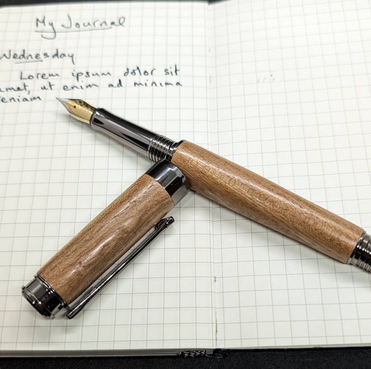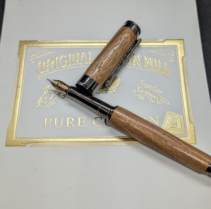 A hand turned fountain pen in Elm with gun metal parts. The tree was revered by the ancient inhabitants of Northern Europe as a sacred tree. Elm was likely introduced by our Bronze Age ancestors. Elm is also prized by bowyers; of the ancient bows found in Europe, a large portion are elm. It has a German iridium nib and a refillable reservoir, it will also take standard cartridges, one of which will be supplied and it will be packaged in a material lined card box. Find links to refills at characterpens.co.uk/refill.html F319