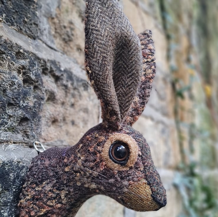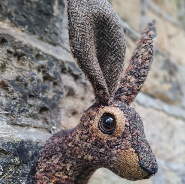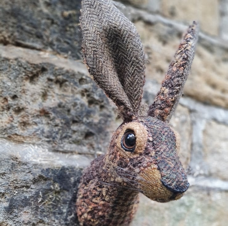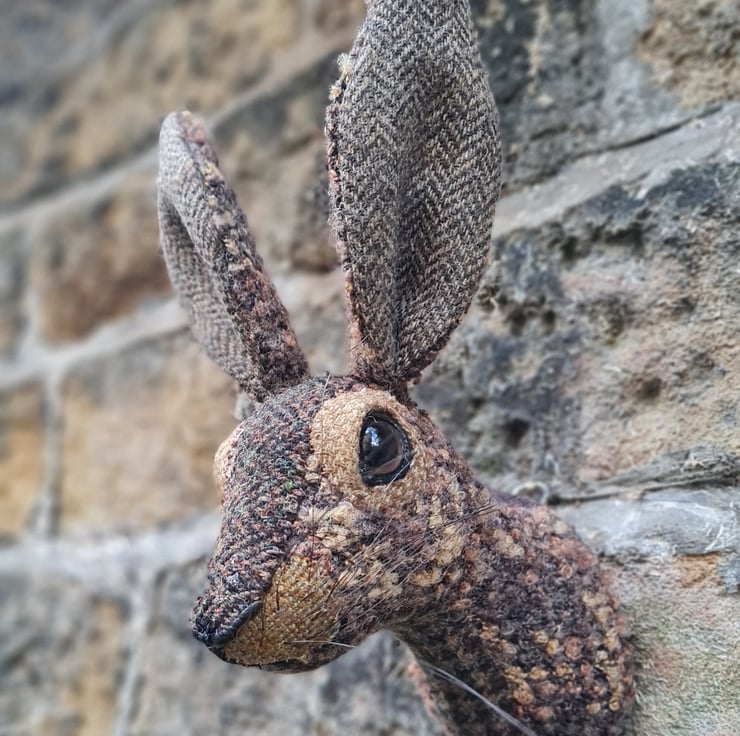 A lifesize textile hare head which I have hand stitched with an array of neutral tweed and wool fabric.