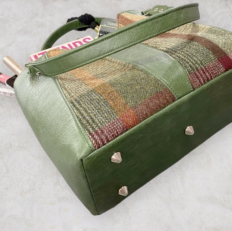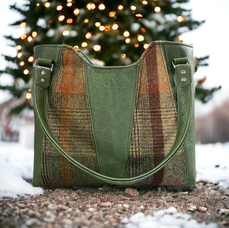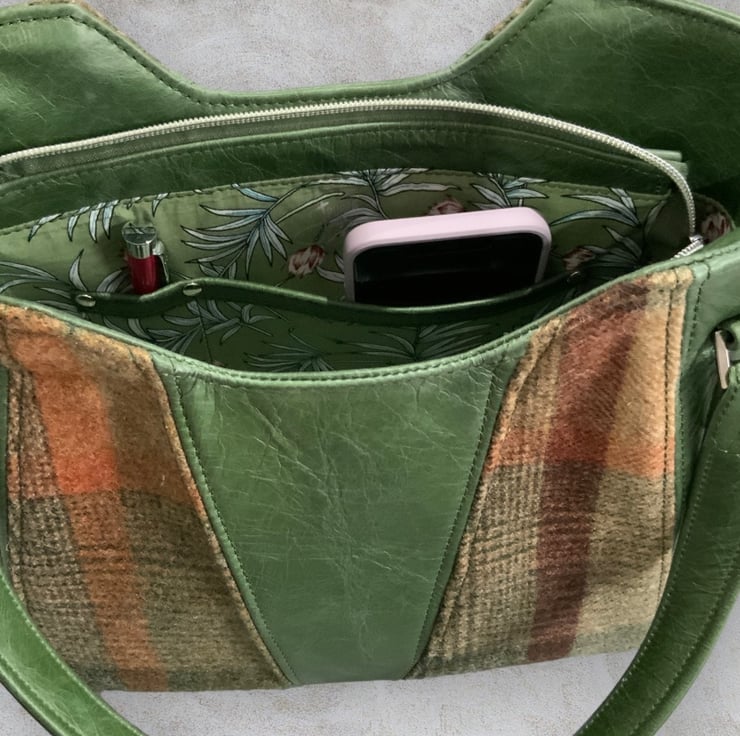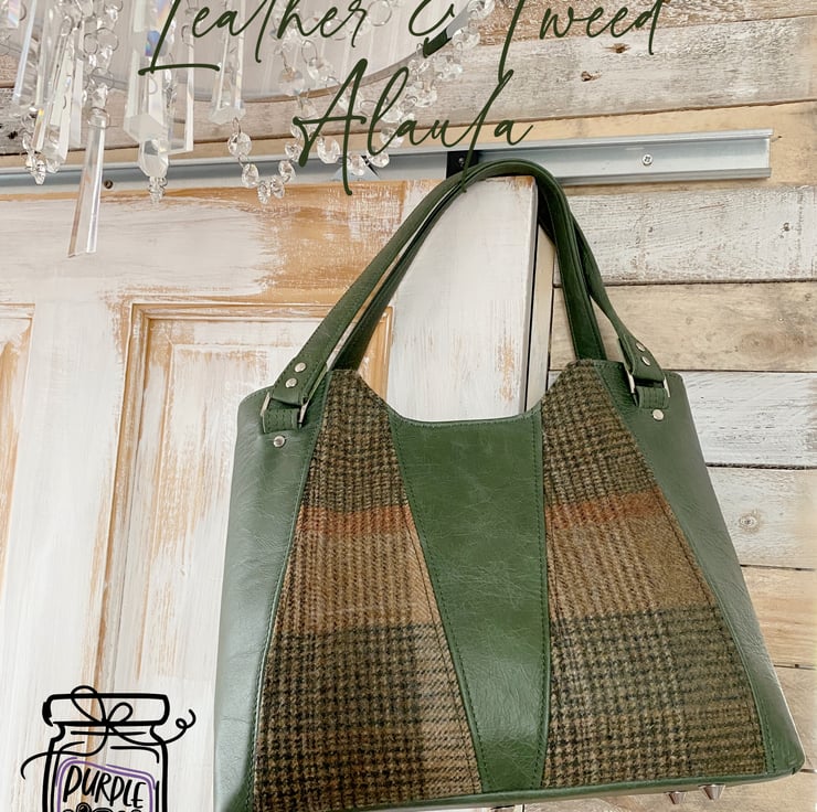 This bag is made using the Alaula bag pattern by Lavender & Twine, at full size (I also make a smaller version, so keep your eye on my Folksy store). I always use the highest quality British and Italian leathers and woollen tweeds, which have been saved from heading to landfill, by a local company