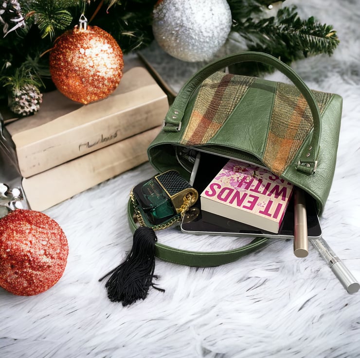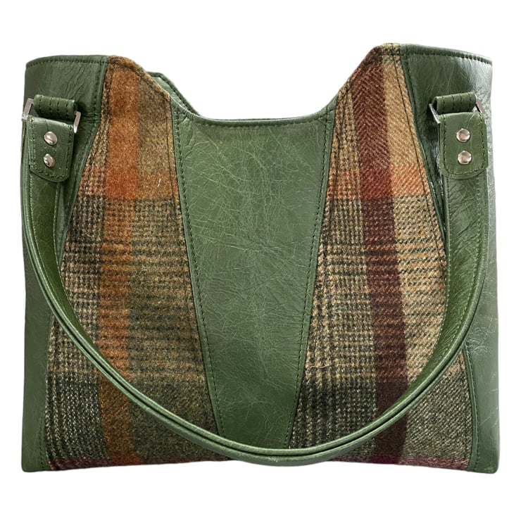 Ooooh, she’s a fancy pants, this one! This large Alaula is hand crafted (by me!), using a beautiful tweed fabric in the autumn/winter shades and a matching green leather - both of these fabrics were rescued from heading to landfill (which would have been a travesty, because look at this thing!)