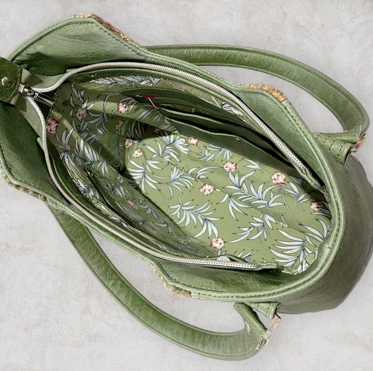 She has a silver zipper opening and is lined with beautiful green, floral cotton with matching green leather trim. Inside are a plethora of pockets to store your essentials and there’s plenty of space for an iPad, making this the perfect bag for work, shopping and every day use.