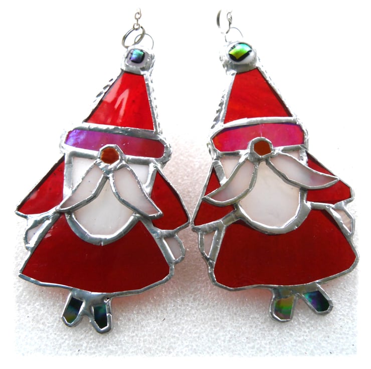 They are cut from brightest red glass with streaky white for a beard and moustache. The hat is decorated with a pompom, a dichroic nugget fused in my kiln. The feet are siver, to give an extra sparkle to the decoration.