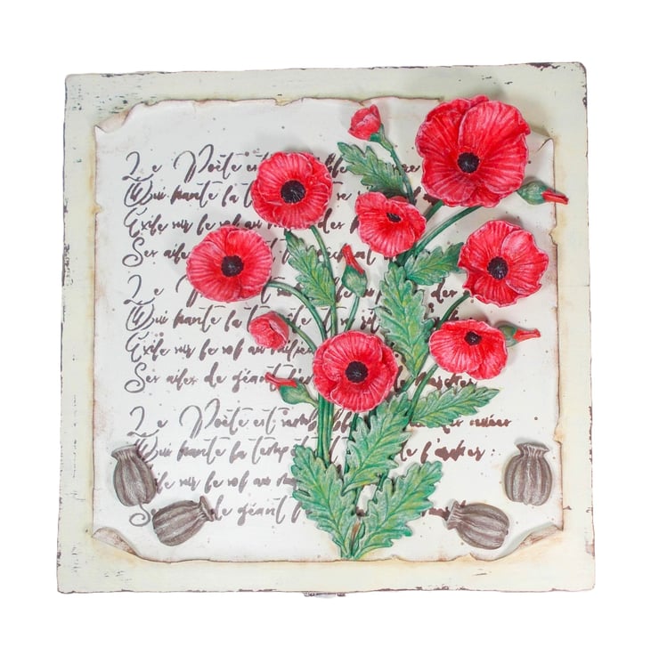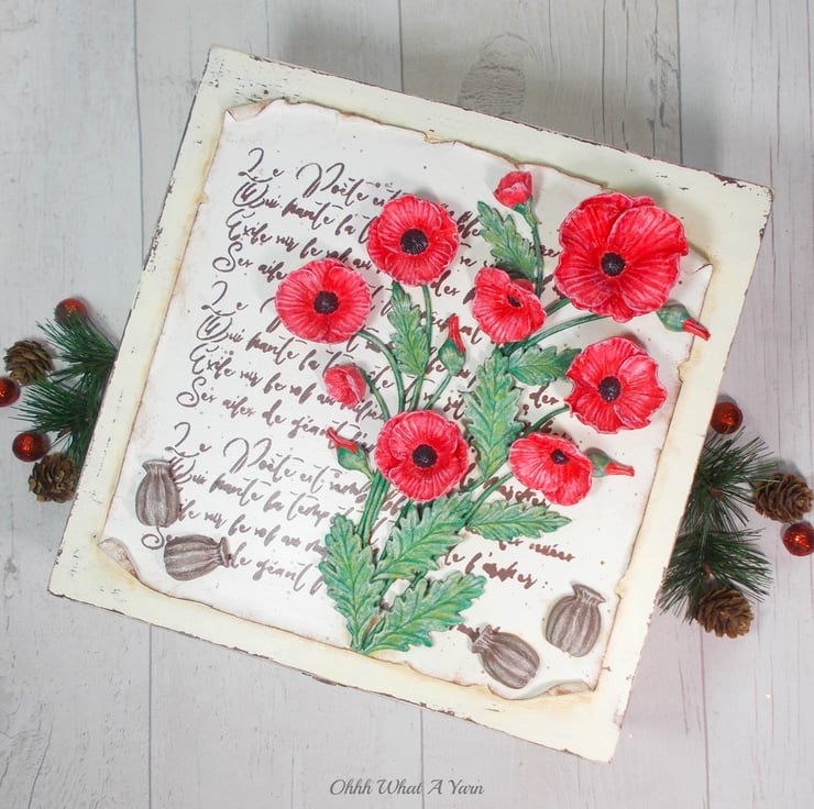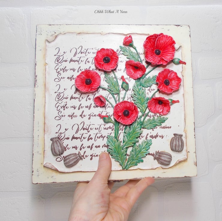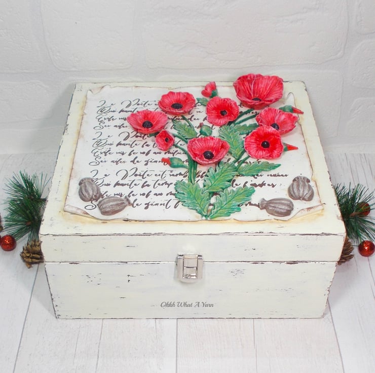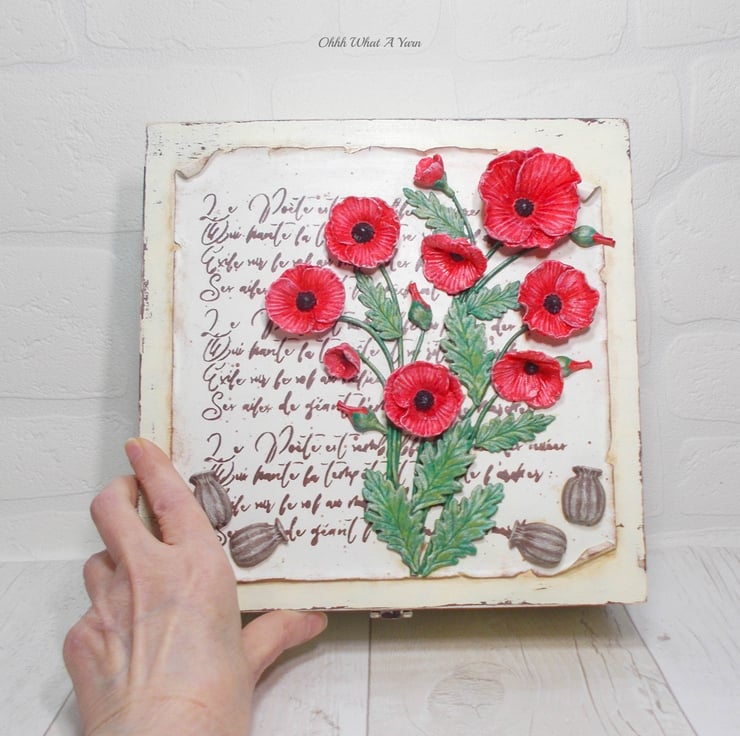 The lid has been decorated with pretty air dry clay poppy flowers, buds, leaves and seed pods.