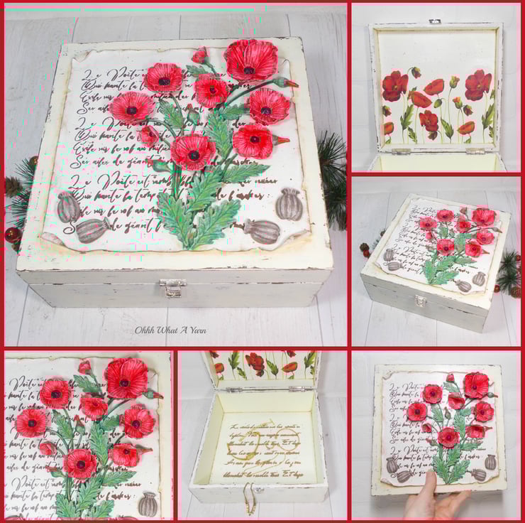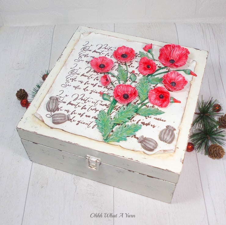 This gorgeous large square mixed media box has been created using decoupage, stencilling, airdry clay and different paint techniques.