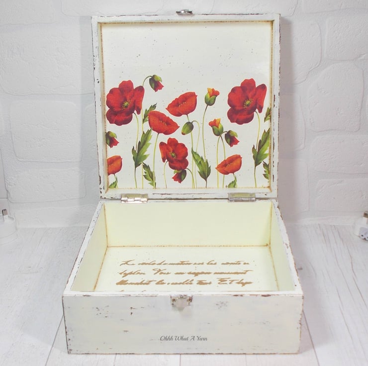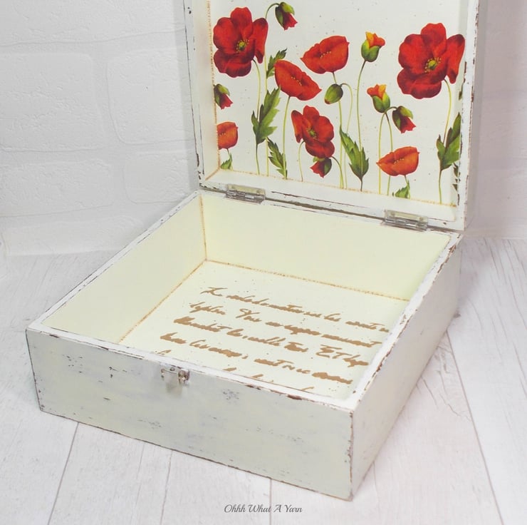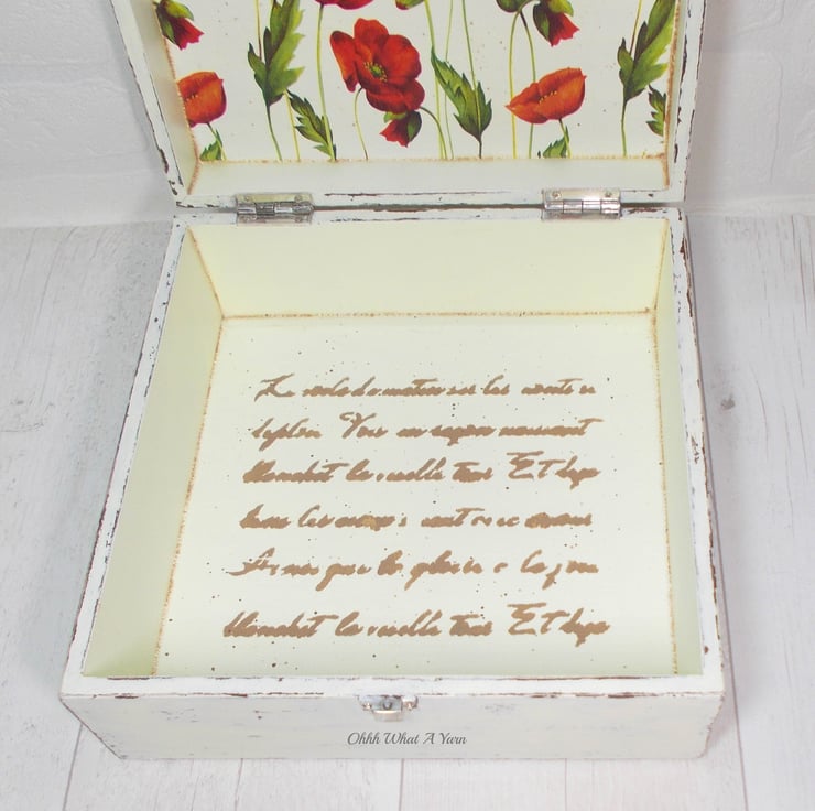 On the interior of the box, I have used a pretty poppy napkin to decoupage inside the lid and I have also stencilled more of the script lettering on the inside of the box.