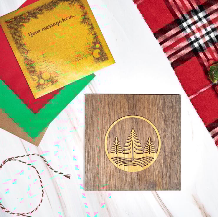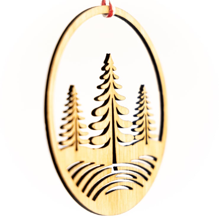 Tired of all those old plastic decorations? Freshen up your d cor this winter season with this beautiful laser cut bamboo decoration that features trees in a winter landscape. Designed and handcrafted in our home studio in Scotland. This fascinating design really stands out in a Christmas tree. Place bright lights behind it and see the silhouette come alive! Alternatively, you can hang it in a window to mark the whole winter season!