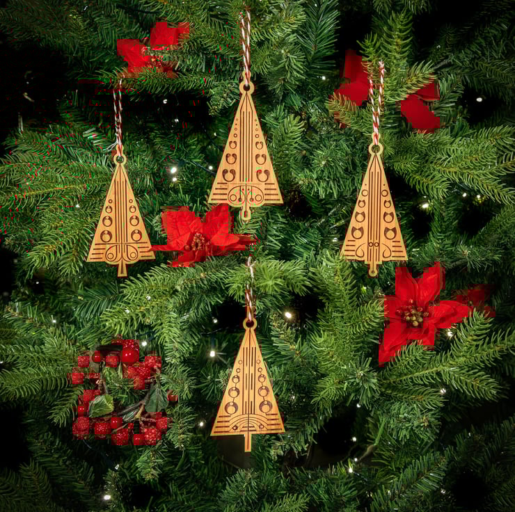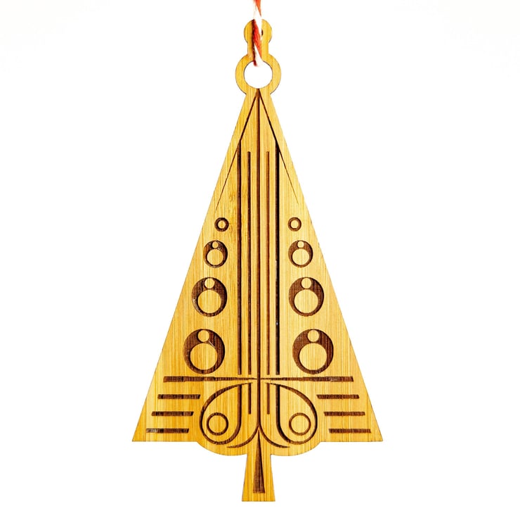These decorations are handcrafted in our home studio in Scotland. We laser cut our Christmas decorations from solid MOSO caramel bamboo. They are hand sanded and then sealed with natural oils and beeswax for a soft natural finish. Don't buy mass produced plastics - acquire something unique and special!