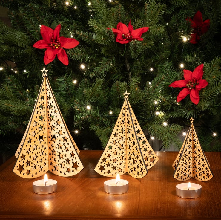 Tired of all those old plastic decorations? Freshen up your décor this winter season with this set of three striking bamboo trees filled with laser cut stars. Designed and handcrafted in our home studio in Scotland. Use them to create a table centrepiece or a decorative feature in your home. Place next to tealights or lamps to show off the intricate star patterns.