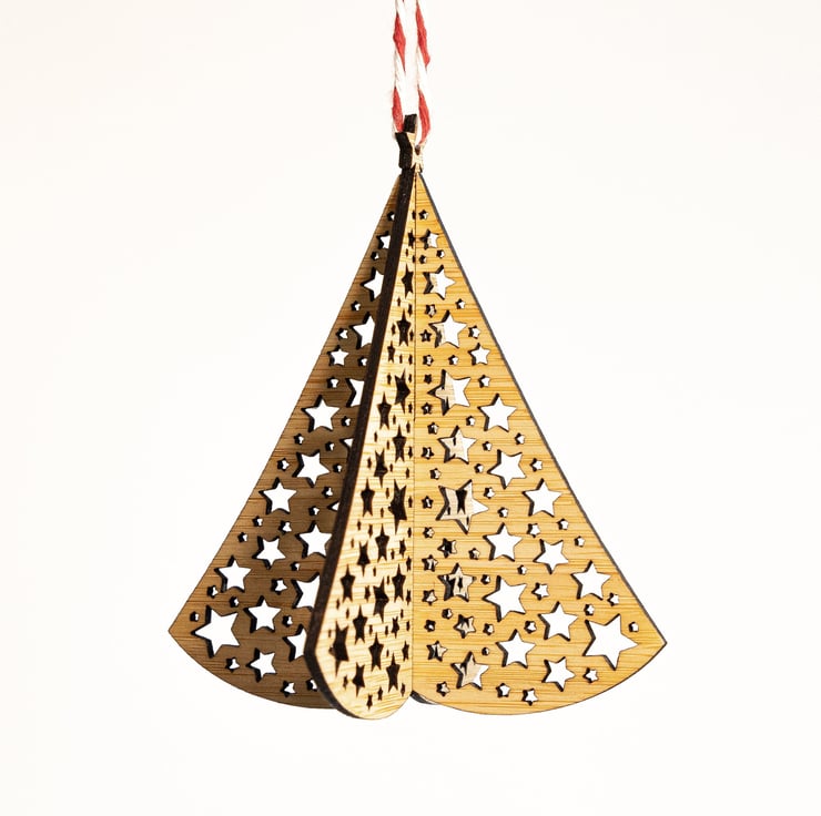 These decorations are handcrafted in our home studio in Scotland. We laser cut our Christmas decorations from solid MOSO caramel bamboo. They are hand sanded and then sealed with natural oils and beeswax for a soft natural finish. Don't buy mass produced plastics - acquire something unique and special!