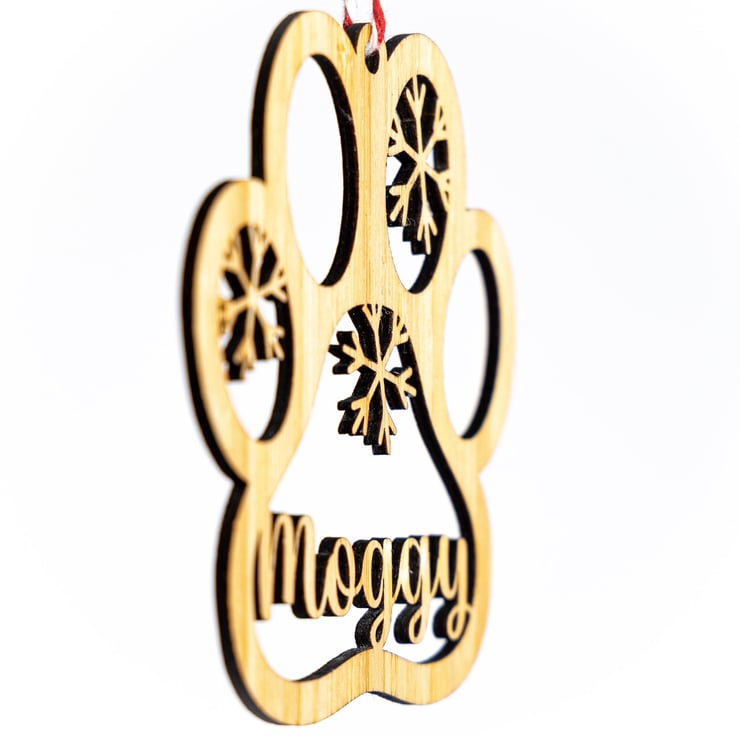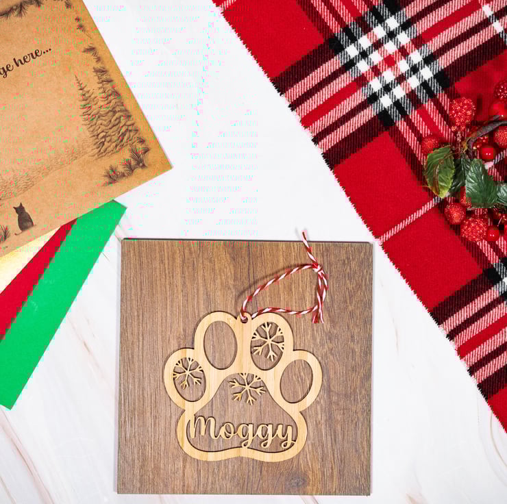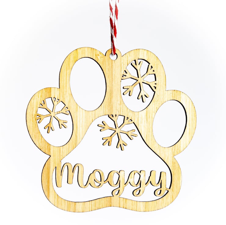 Create your own special Christmas decorations for your gorgeous kitty friends this year! Add your cat's name into this paw print ornament that is decorated with snowflakes. We will incorporate the name into the design and create your bespoke laser cut decoration! Hang in your Christmas tree or over their favourite spot to sleep.