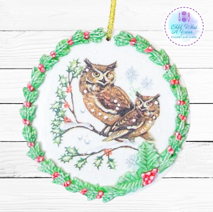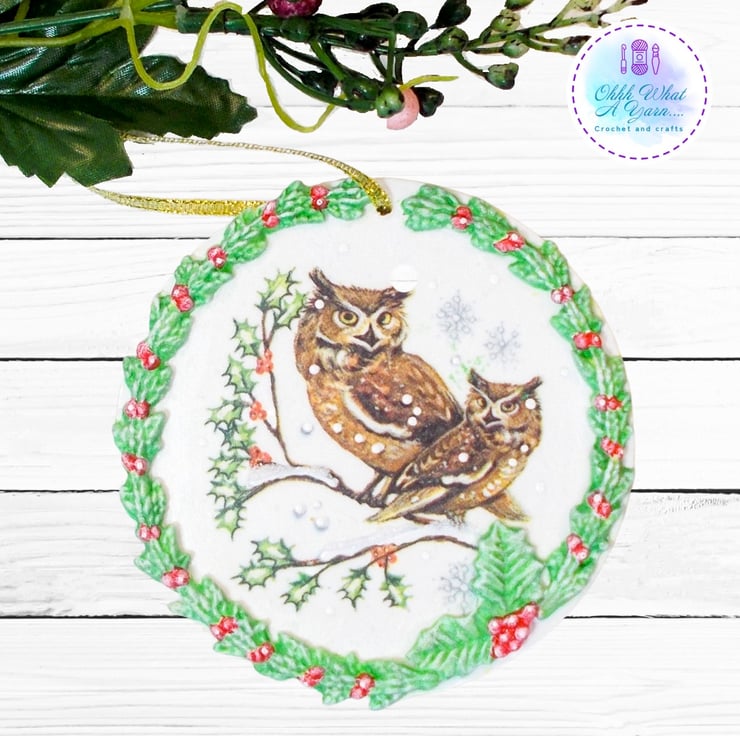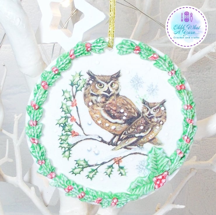 I have decoupaged it with a winter owl napkin and added air dry clay leaves and berries which I have painted with acrylic paints. I have added hand painted details to the bird image including some glittery snowy 3D effect paint.