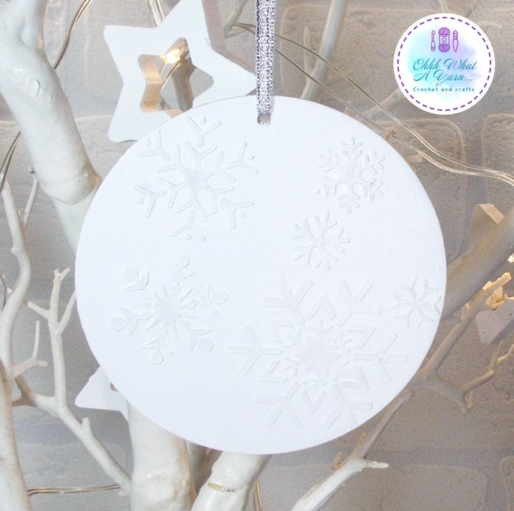 The reverse of the decoration has been stencilled with pretty snowflakes which I have then painted with acrylic paint and added glittery Mica powders for extra sparkle.