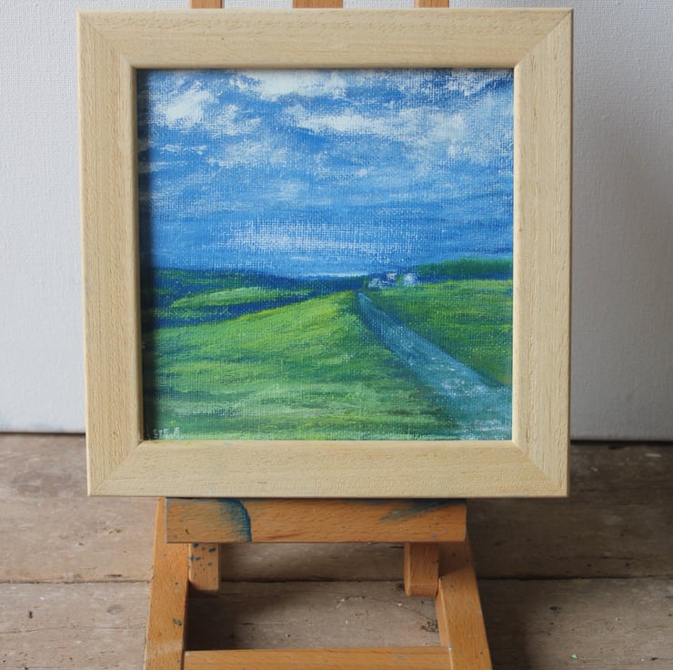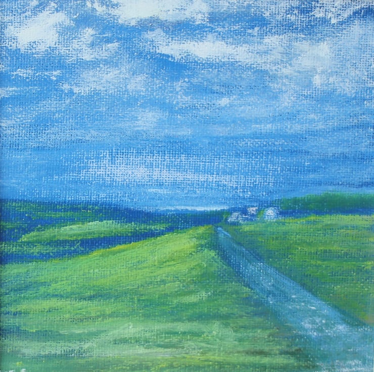 An oil sketch capturing the field shapes and a glimpse of the distance sea.