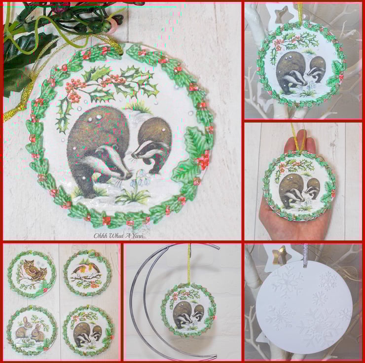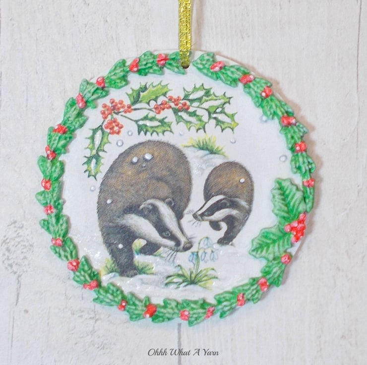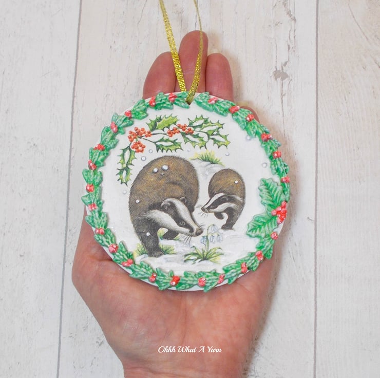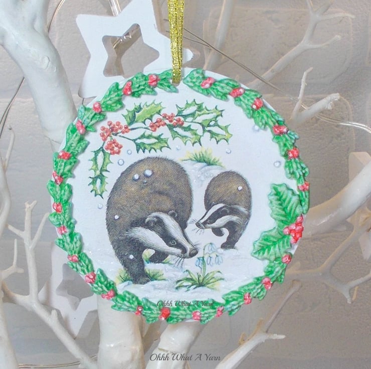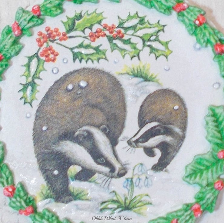 I have decoupaged it with a winter badgers napkin and added air dry clay leaves and berries which I have painted with acrylic paints. I have added hand painted details to the badgers image including some glittery snowy 3D effect paint.