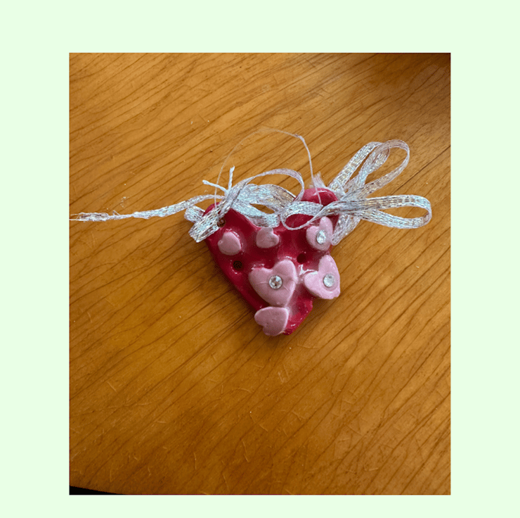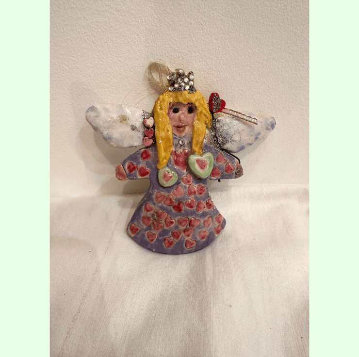 Elevate your Christmas tree to celestial heights with our enchanting handmade ceramic angel ornament. This crafted piece is a testament to artistic mastery and holiday spirit. Adorned with meticulous details, this angel boasts a celestial aura with flowing yellow hair that cascades like rays of sunshine. Her lavender-blue dress, delicately decorated with pink hearts, radiates warmth and love.