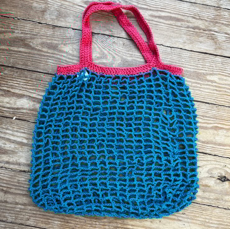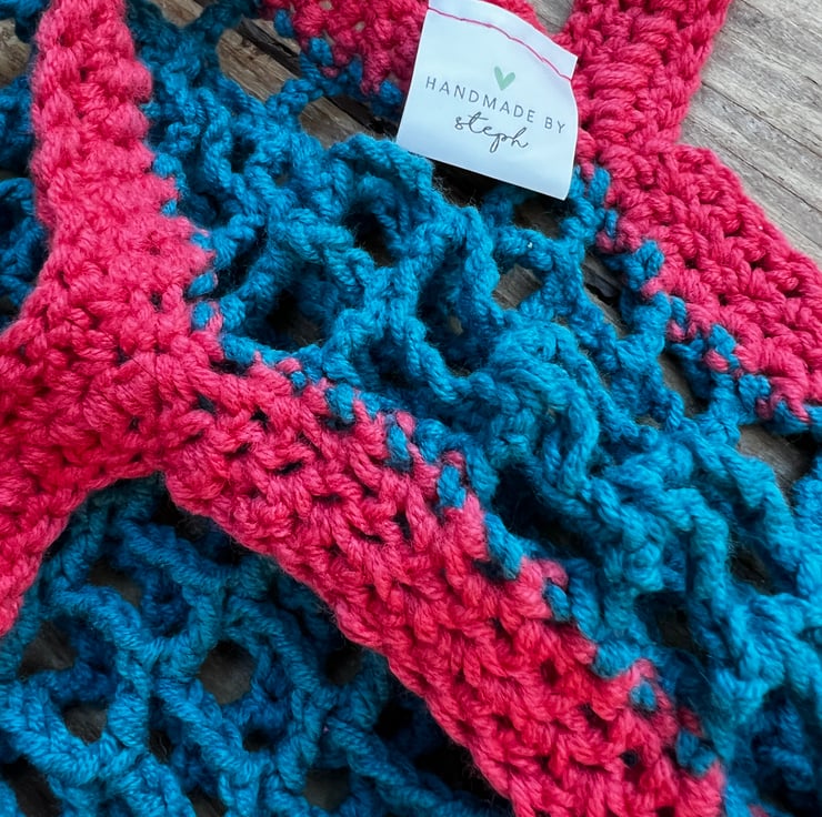 Handmade Crochet Market bag. The must have accessory for the Farmers Market, or the vegetable aisle during your weekly shop. Full mesh bag, with contrasting trim and straps. Main colour is peacock with trim & two straps in coral. Made in Dorset, UK. With label saying handmade by Steph.