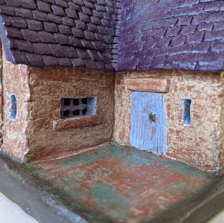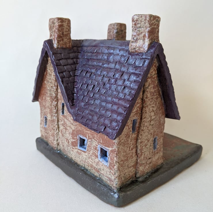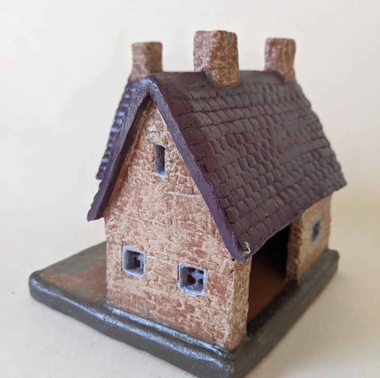 Slate Roof Farmhouse Tealight Holder. All items are made from scratch. I draw and plan each building then cut the pieces out of clay. I add textures and details then build them. Once they are assembled I decorate them with coloured clays and oxides before the bisque firing then they are glazed and fired once more. Every little building is unique.