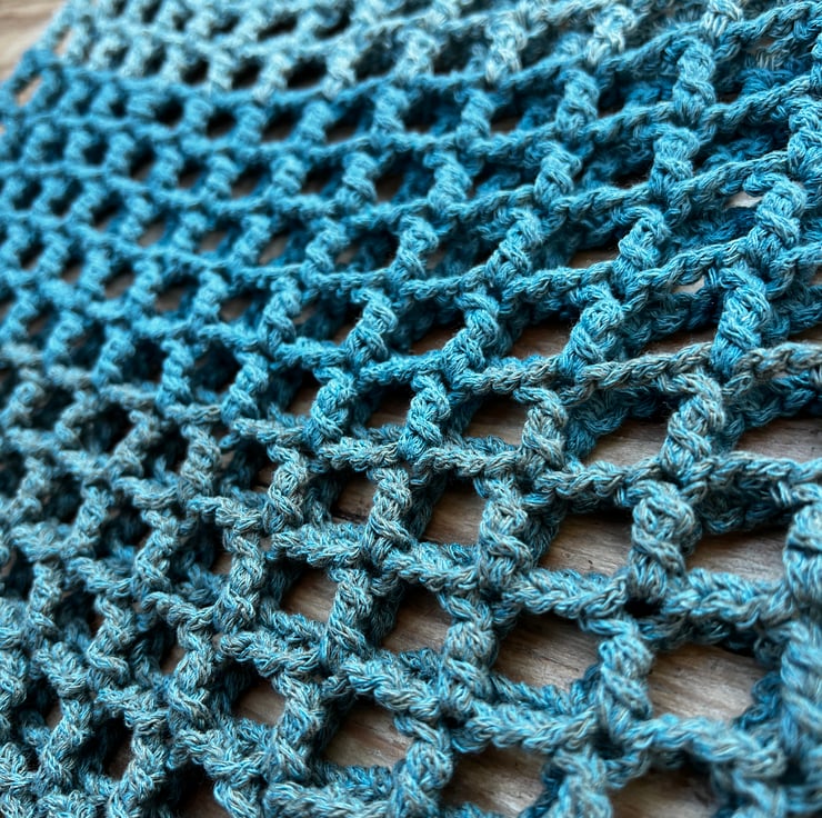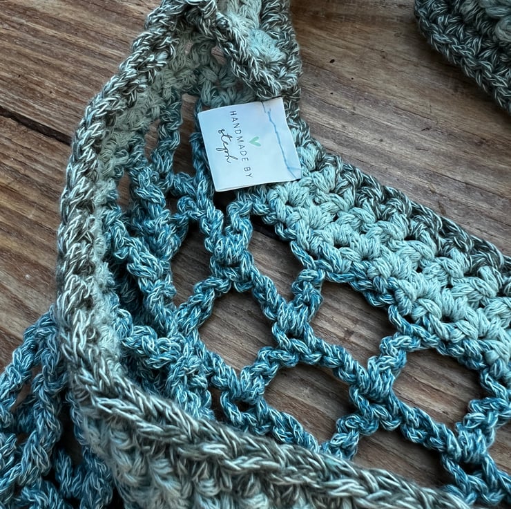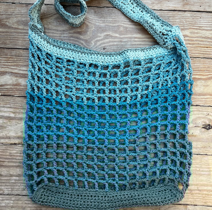 Handmade Crochet Beach bag. The must have accessory for a day on the beach, or exotic holiday. Wide mesh bag with reinforced base and one shoulder strap, in colours that remind me of stormy skies. Don't worry the skies will stay clear & blue. Made in Dorset, UK. With label saying handmade by Steph.