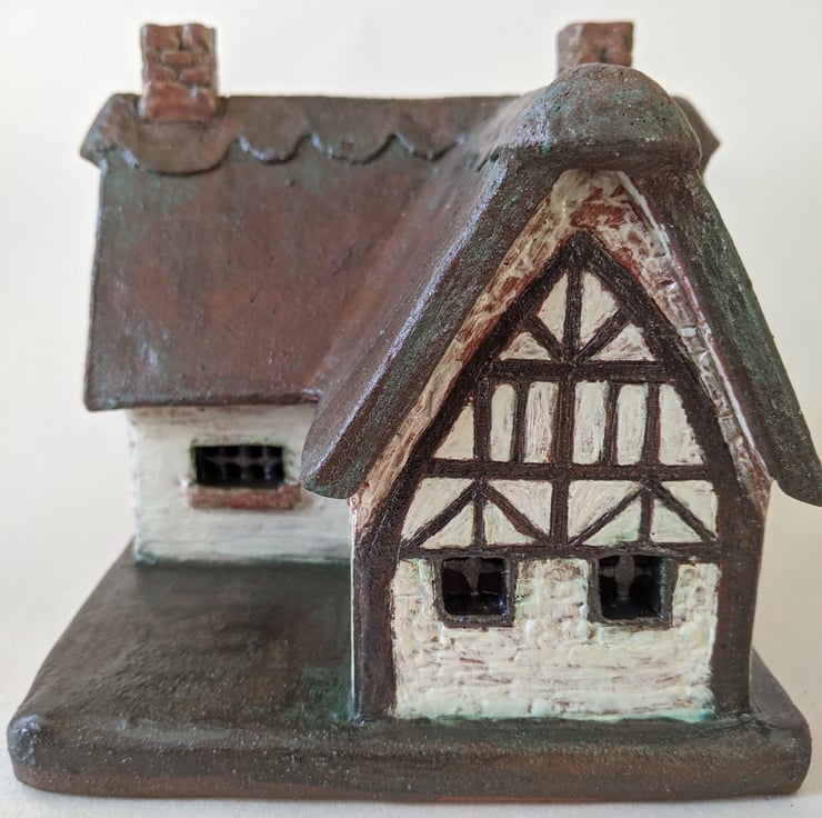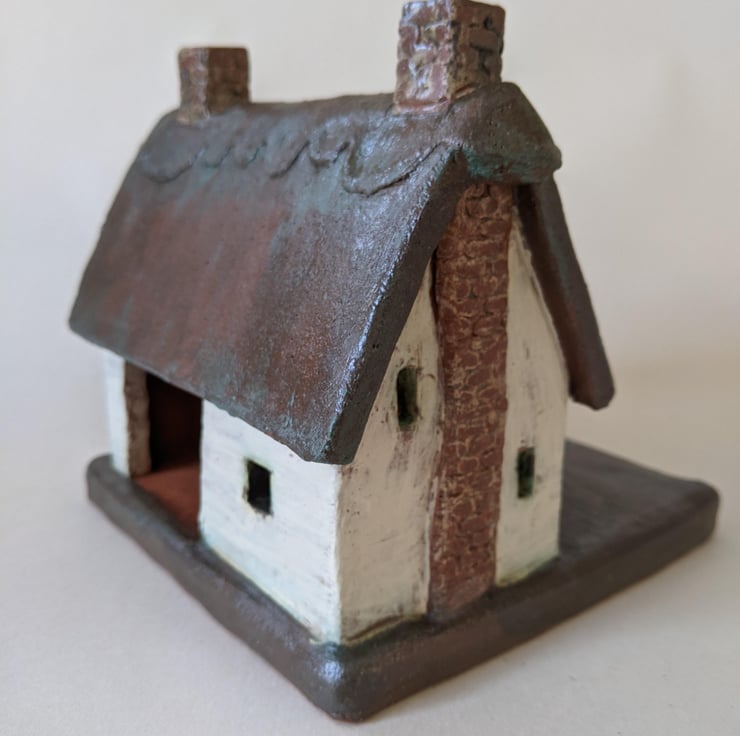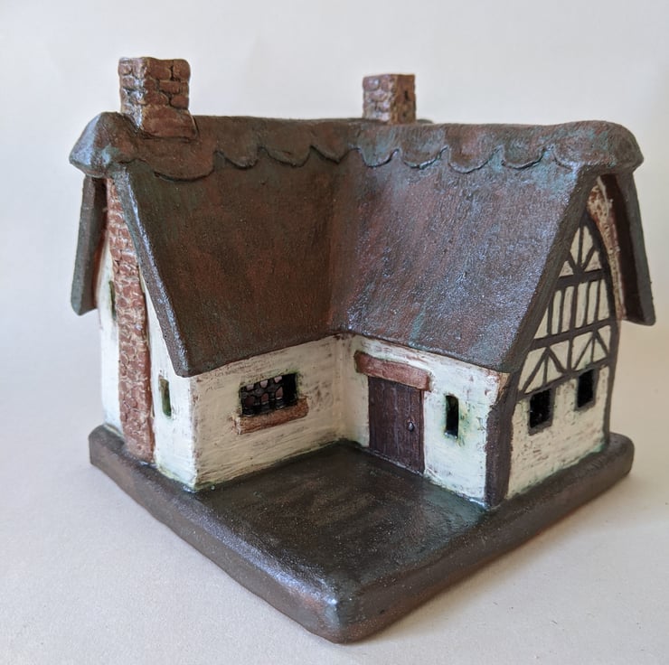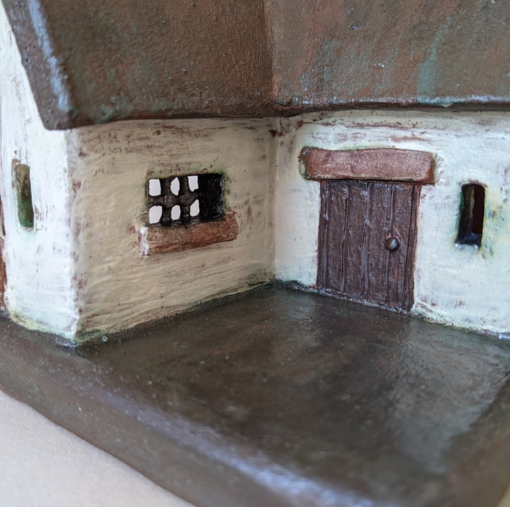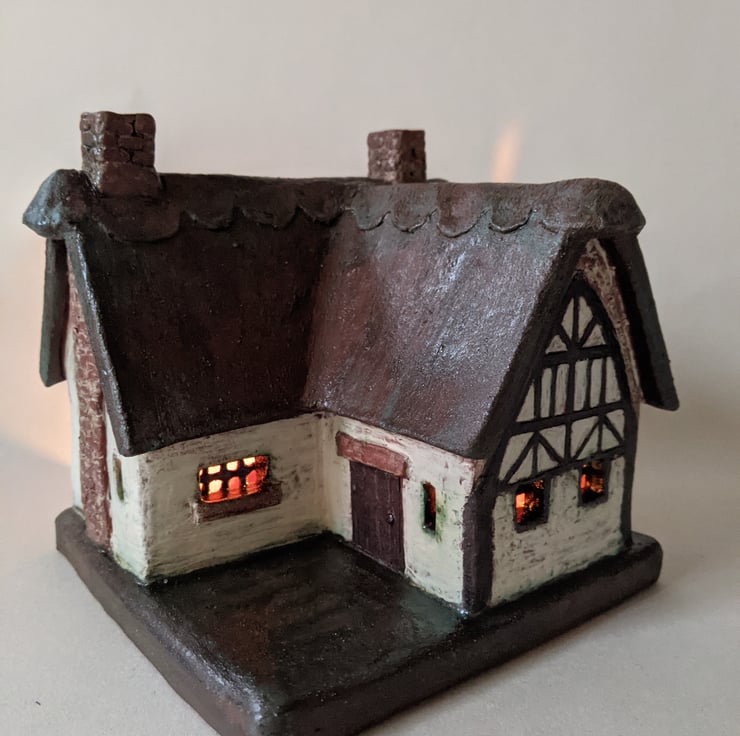 Thatched Roof Medieval Farmhouse Tealight Holder. All items are made from scratch. I draw and plan each building then cut the pieces out of clay. I add textures and details then build them. Once they are assembled I decorate them with coloured clays and oxides before the bisque firing then they are glazed and fired once more. Every little building is unique.